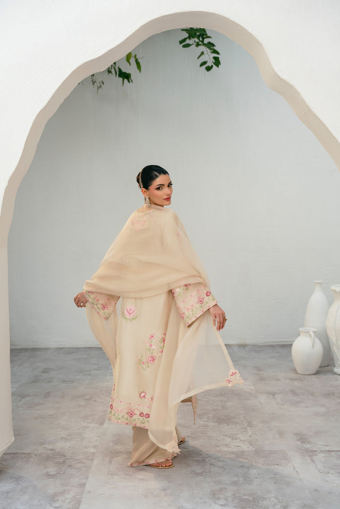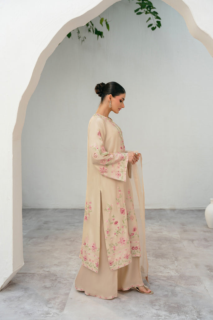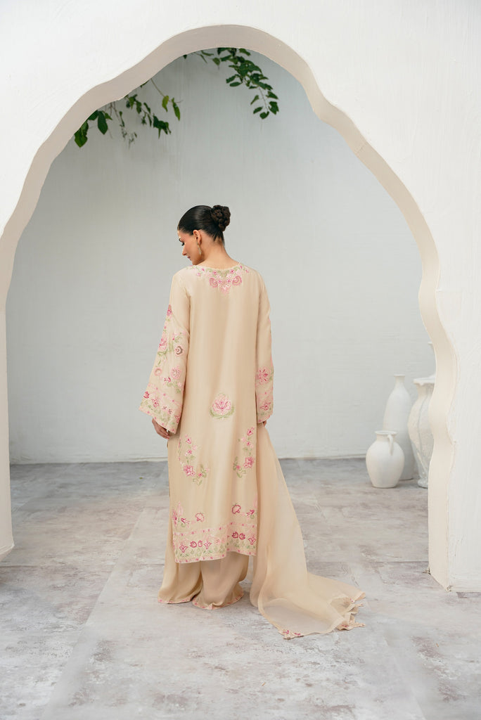Experience the art of effortless elegance with the ethereal " Adara Bisque " ensemble. Offering a modern yet timeless silhouette on pure raw silk, adorned with applique details. Paired with a matching pure raw silk trouser alongside a pure soft tissue organza with cutwork motifs. This ensemble exudes grace and sophistication, making it a beloved and essential addition to any wardrobe. The length of the long kameez is 47 inches.