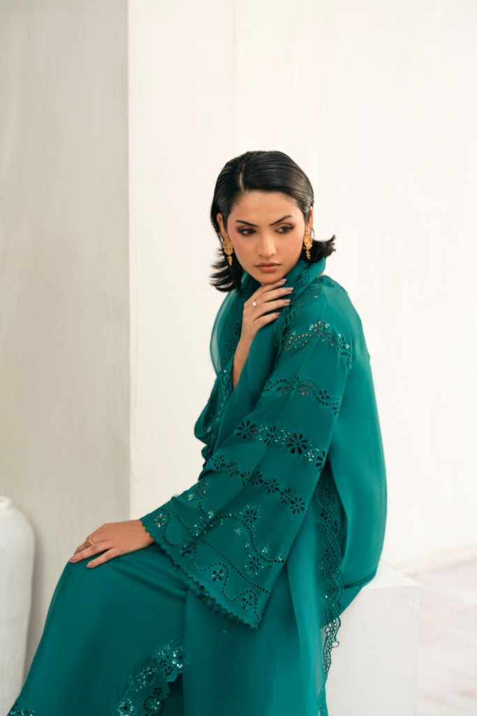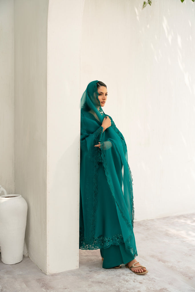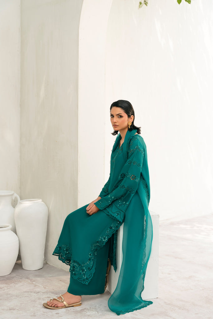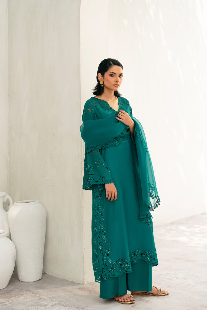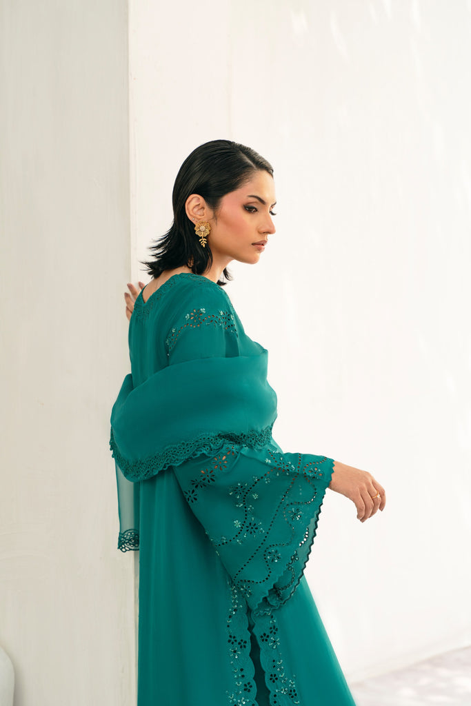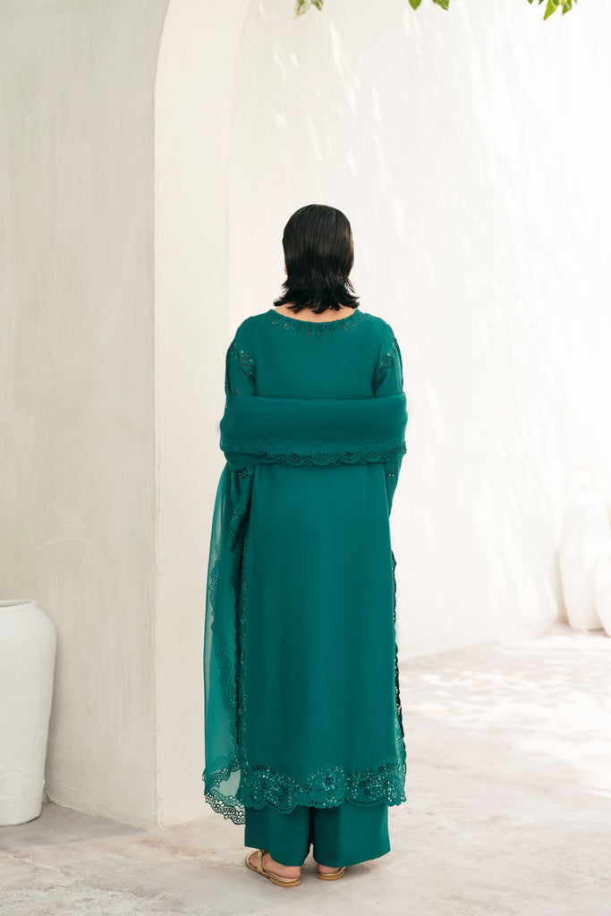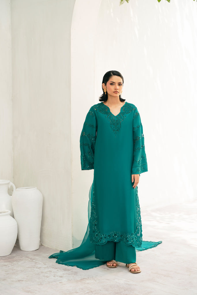 Offering a modern yet timeless silhouette on pure raw silk 60 gms, adorned with cutwork details alongside maroon sequins and cutdana. Paired with a matching pure soft tissue scalloped organza dupatta and pure raw silk trousers as seen. This ensemble exudes grace and sophistication, making it a beloved and essential addition to any wardrobe. The length of the long kamees is 48 inches.