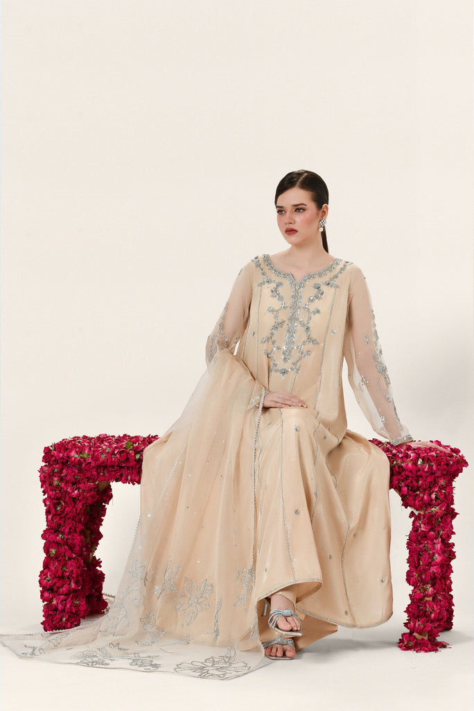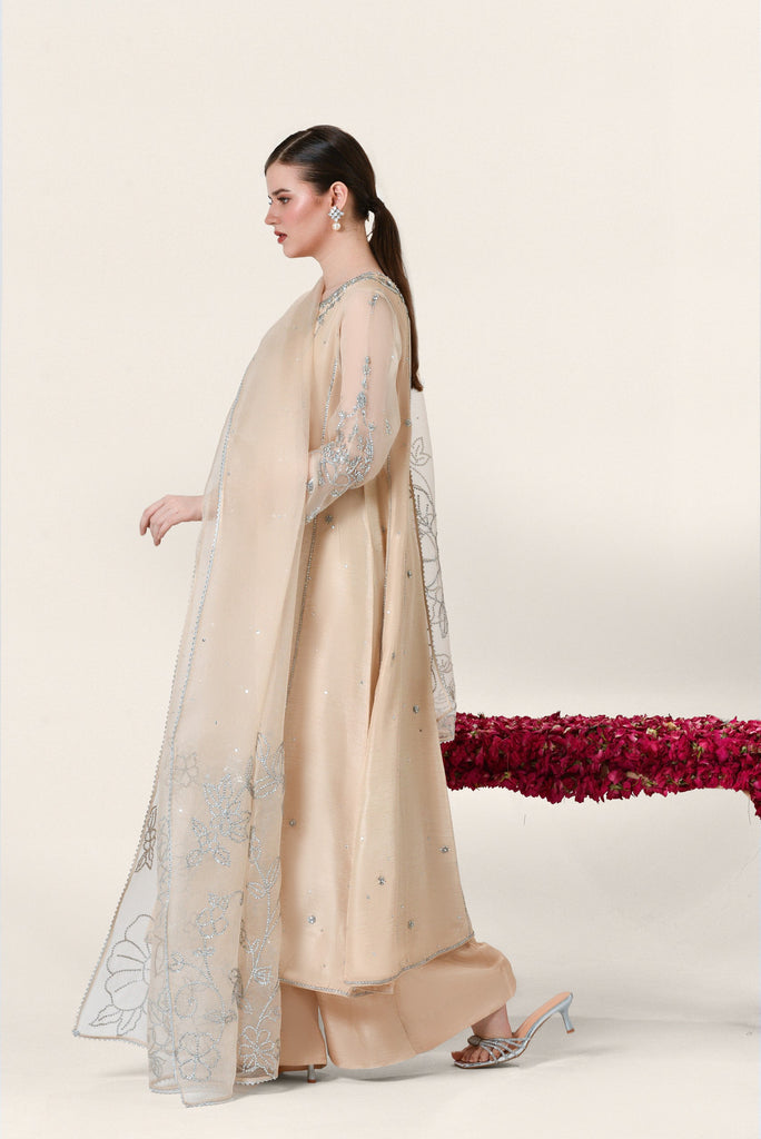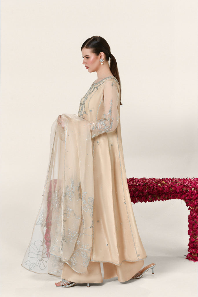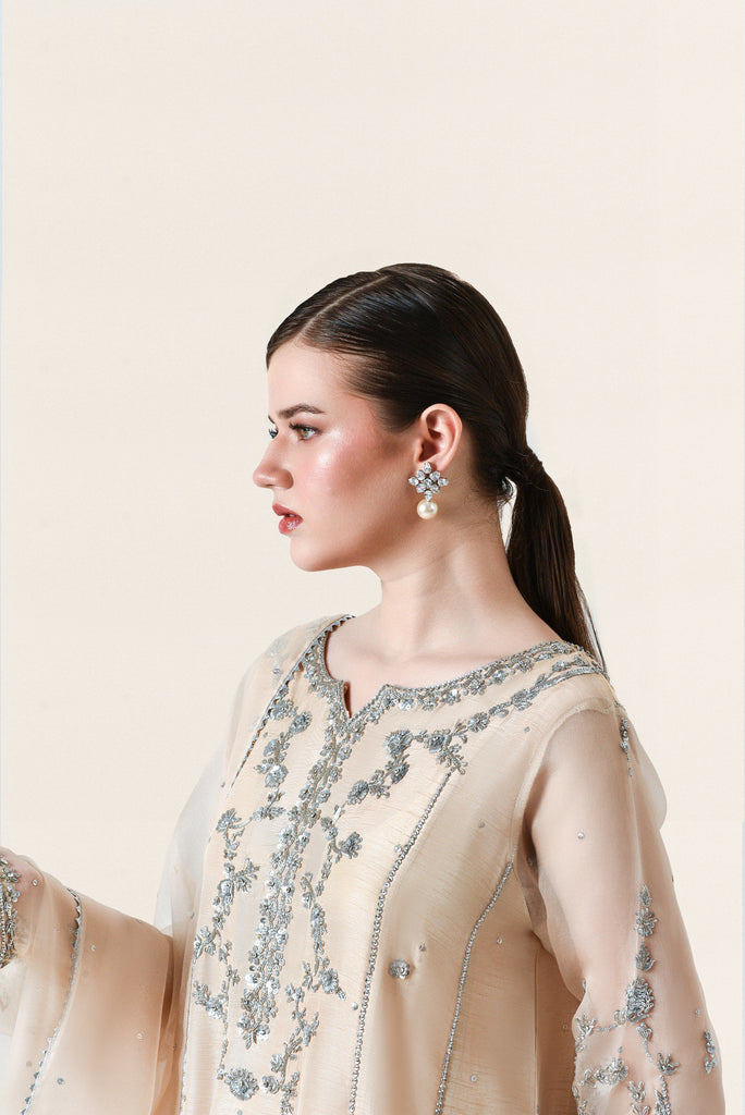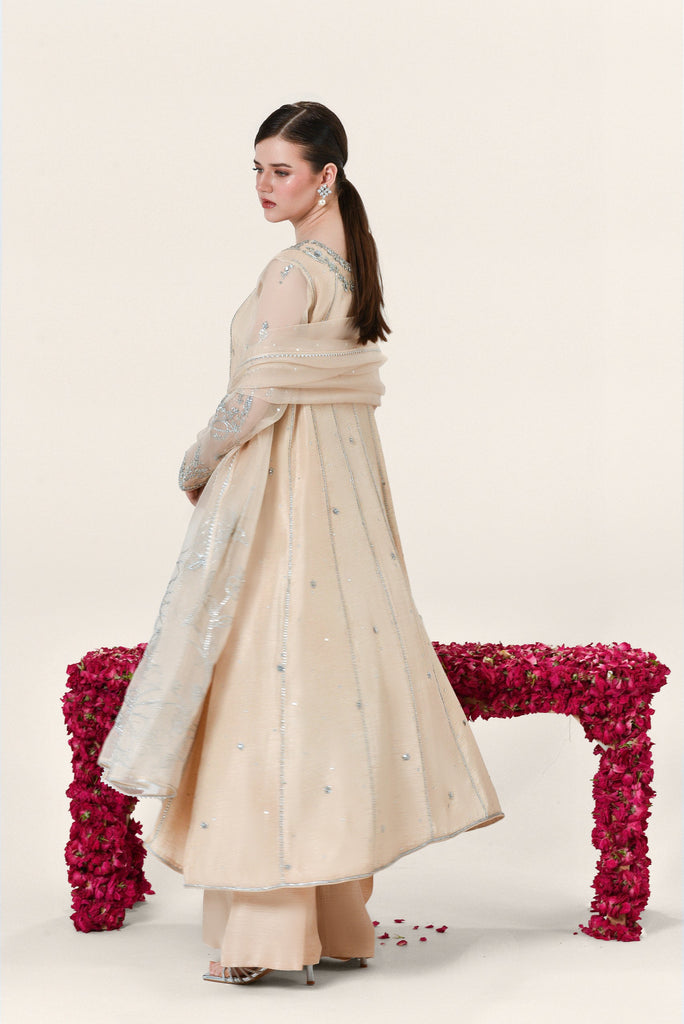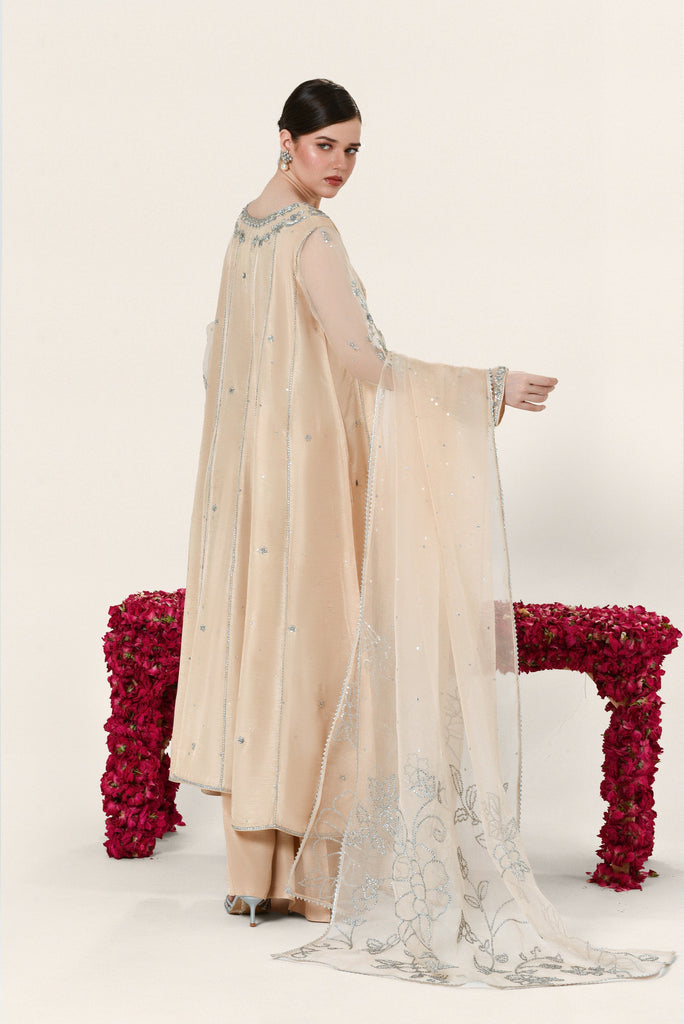 Experience the art of effortless elegance with the ethereal " Arabella " ensemble. Offering a traditional yet modern long kalidaar silhouette, heavily adorned with silver hand/ada work details of crystals, dabka, naqshi and nug.. Paired with a matching pure soft tissue organza dupatta featuring florals. This ensemble exudes grace and sophistication, making it a beloved and essential addition to any wardrobe. The length of the long kalidaar is 48 inches. This look is completed with Izaar as seen.