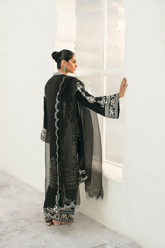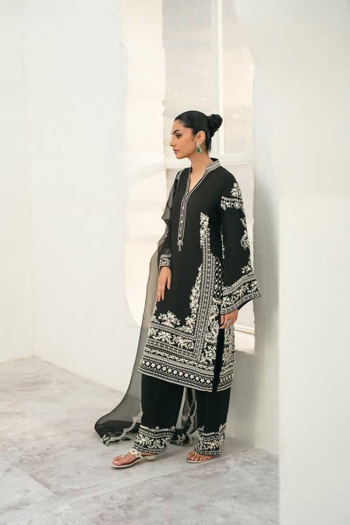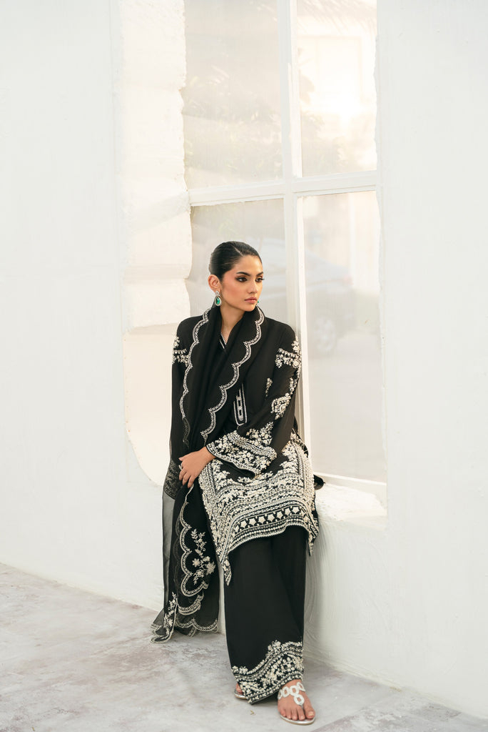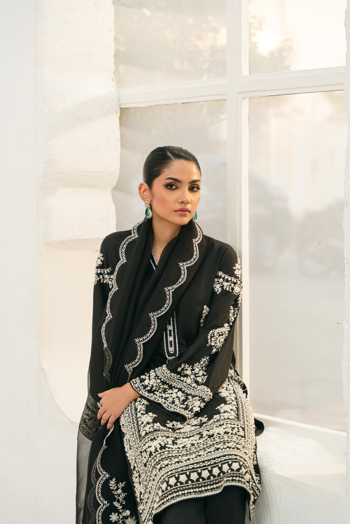 Experience the art of effortless elegance with the ethereal "Cyra" ensemble. Offering a modern yet timeless silhouette on pure raw silk, adorned with intricate threadwork details. Paired with a matching pure raw silk shalwar alongside a pure soft tissue organza dupatta with scalloped border. This ensemble exudes grace and sophistication, making it a beloved and essential addition to any wardrobe. The length of the long kameez is 40 inches.