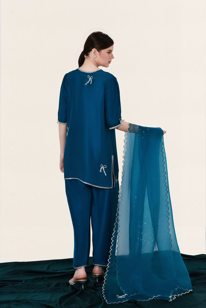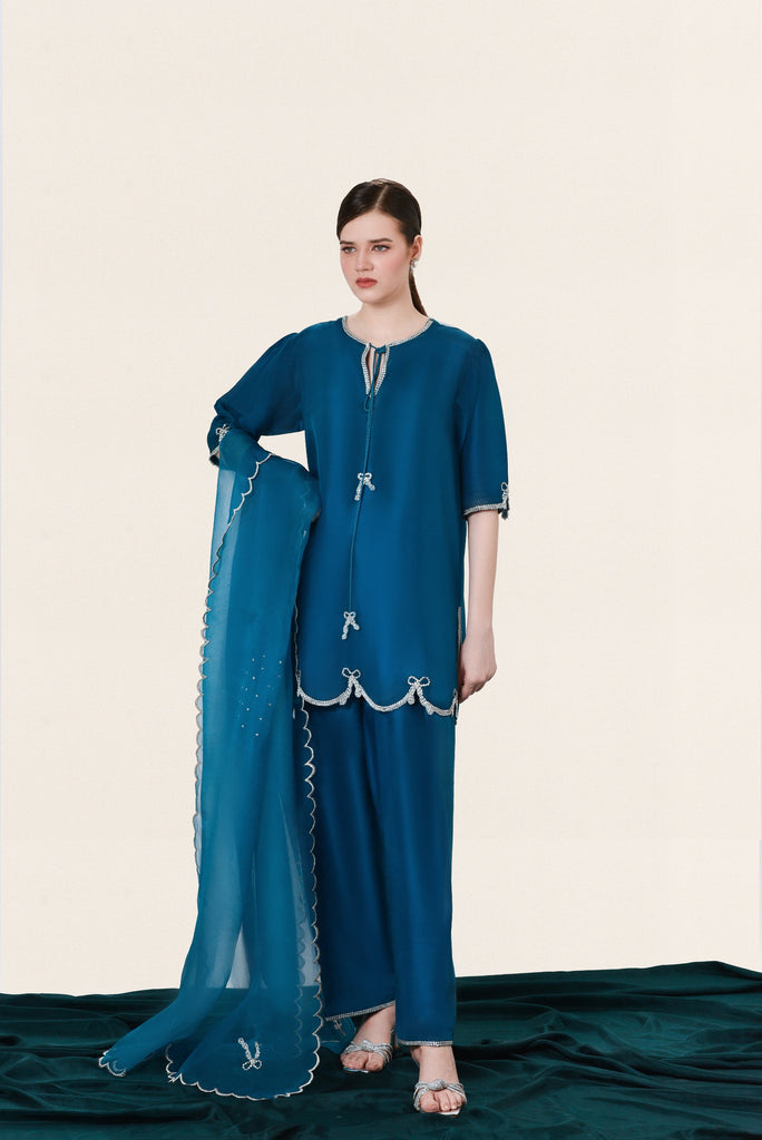 Curated on luscious pure teal blue raw silk with intricate ada/hand details. Styled with a pure soft tissue organza dupatta accentuated with scalloped borders. A beautiful three piece, perfect for festive events. The length of the short kameez is 32 inches.