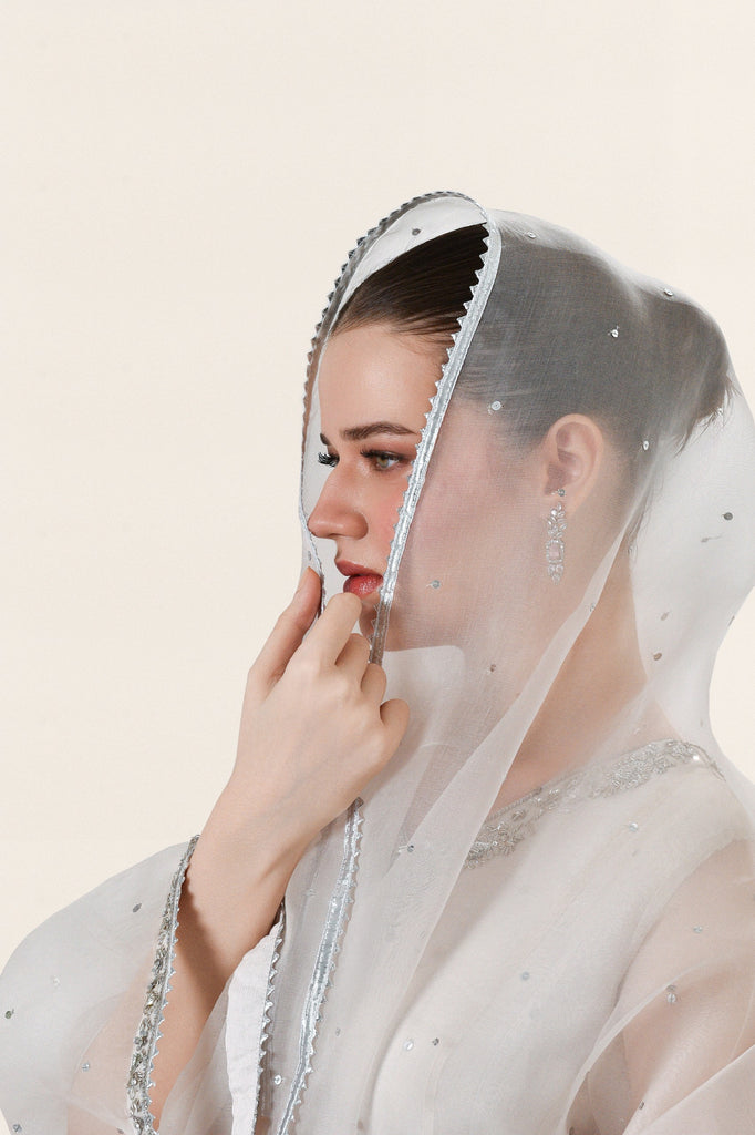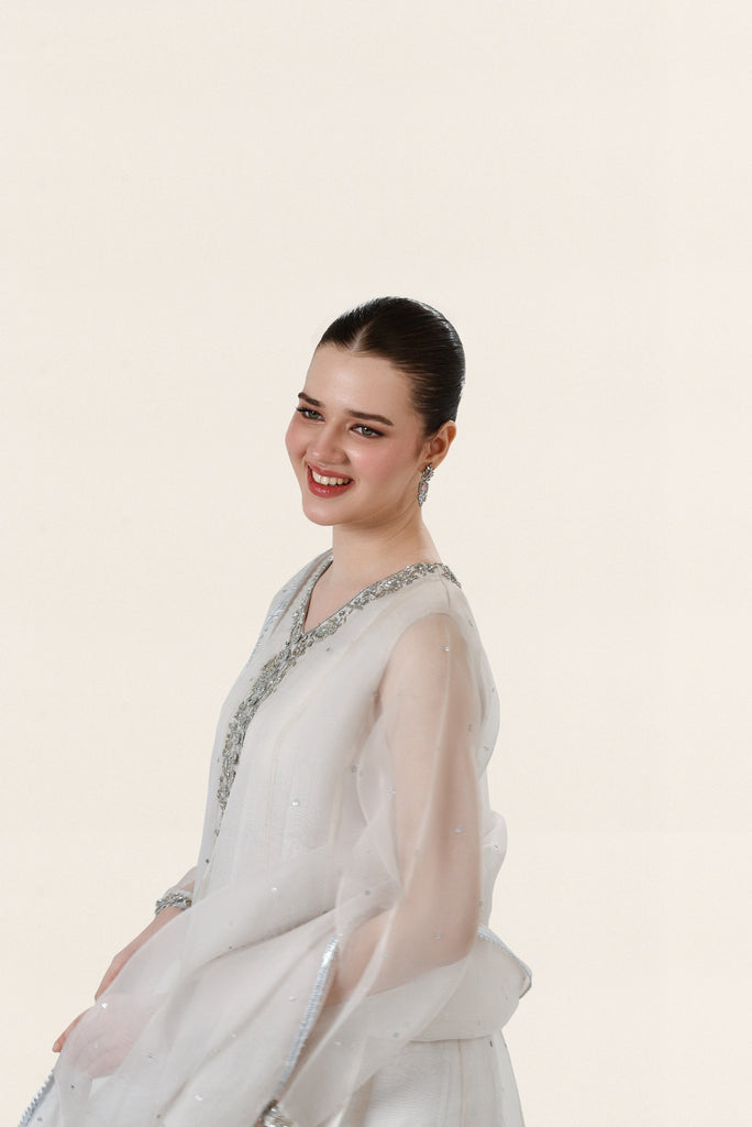 Timeless elegance and unmatched details make up for our Mala ensemble. Curated on ivory pure organza kalidaar adorned with stunning silver handwork details. Styled with an ethereal matching soft tissue organza dupatta alongside matching Izaar to complete this beautiful design. A must have look that can be dressed up or down according to the occasion.