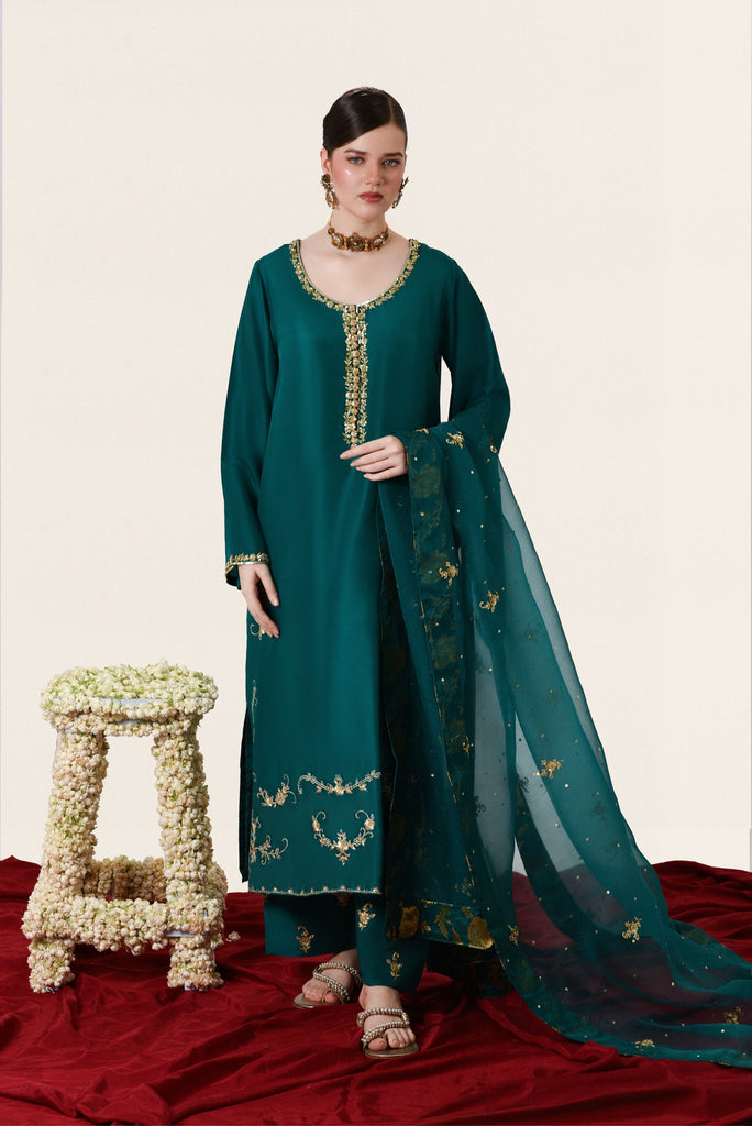 Minoo, with its spellbinding pure raw silk 60 gms silhouette, is a celebration of craftsmanship and refined taste. The long Kameez is rendered in the most beautiful shade of poison green is a work of art, featuring intricate hand embellishments alongside zari details that adorn the entire piece. The heavy neckline adds a touch of regality, while the zari detailing lends a contemporary and alluring charm to the overall look. A three piece that you will keep coming back to. The length of the long Kameez is 47 inches.