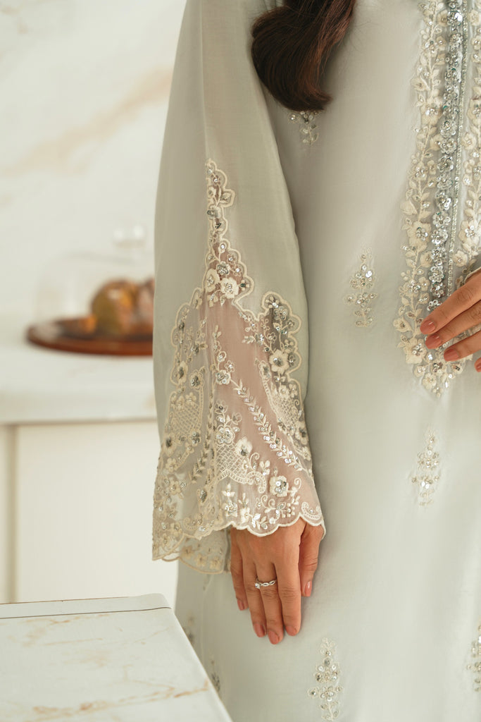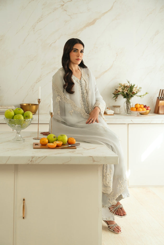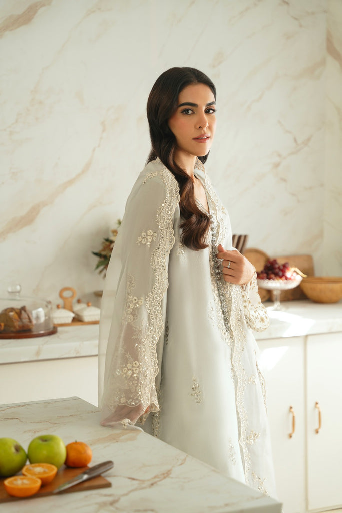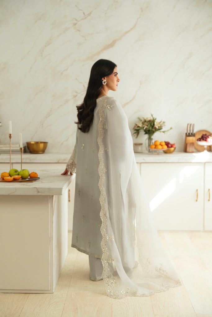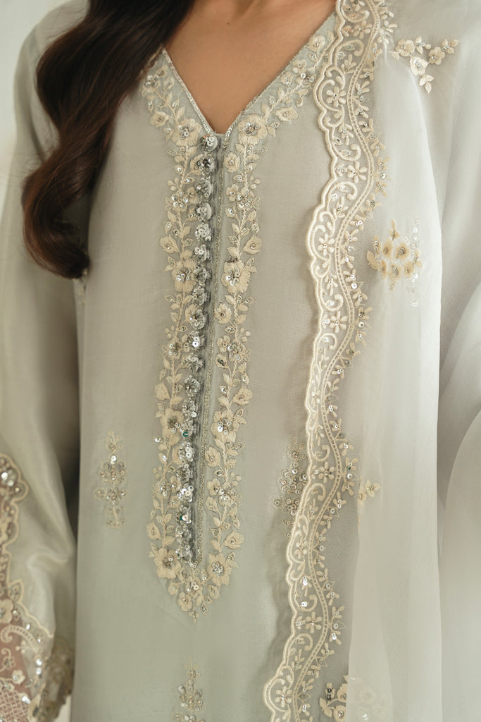 Discover Agha Noor's festive pure raw silk 60 gms three piece suits, created with utmost detailing alongside immaculate tailoring. A canvas of stunning pearl grey pure raw silk, is enhanced with uplifting florals in threadwork with clusters of sequins, pearls and crystals all sewn by hand with silver zardozi buttons on the neckline. Styled with a matching scalloped organza dupatta dupatta and embellished Izaar as seen.