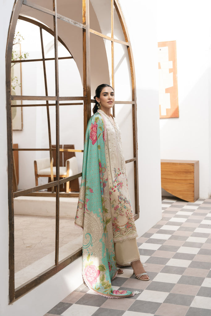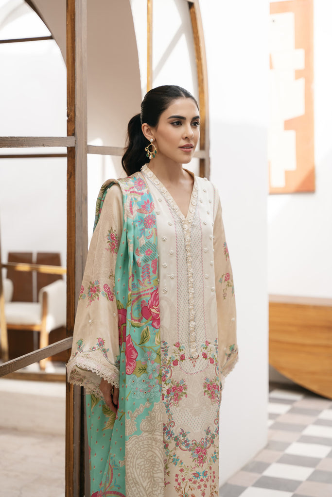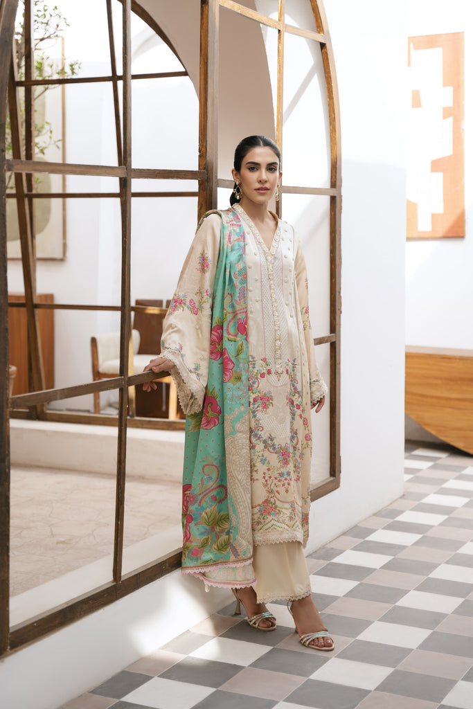 Experience the art of effortless elegance with the ethereal " Lina " ensemble. Offering a modern yet timeless silhouette on printed silk, adorned with an embroidered details featuring clusters of pearls. Paired with an elegant matching pure raw silk Izaar, alongside a matching silk dupatta. This ensemble exudes grace and sophistication, making it a beloved and essential addition to any wardrobe. The length of the long kameez is 45 inches.