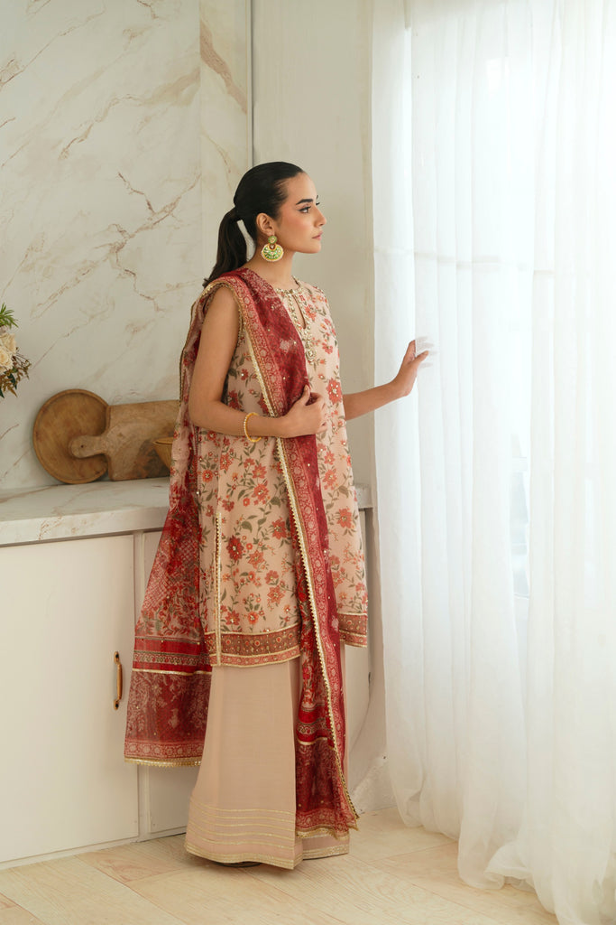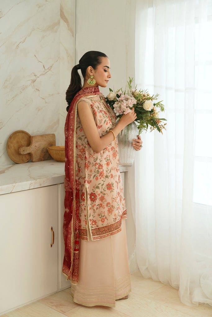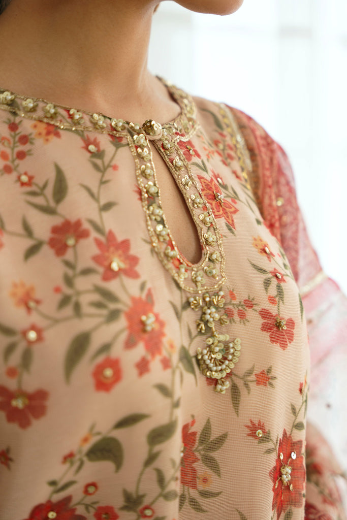 Experience the art of effortless elegance with the ethereal " Iraah Silk" ensemble. Offering a modern yet timeless silhouette on printed organza, adorned with intricate gold handwork details. Paired with an elegant matching raw silk Izaar as seen, alongside a matching organza dupatta. This ensemble exudes grace and sophistication, making it a beloved and essential addition to any wardrobe. The length of the kameez is 40 inches.