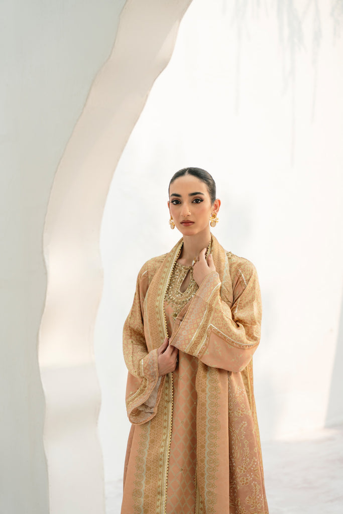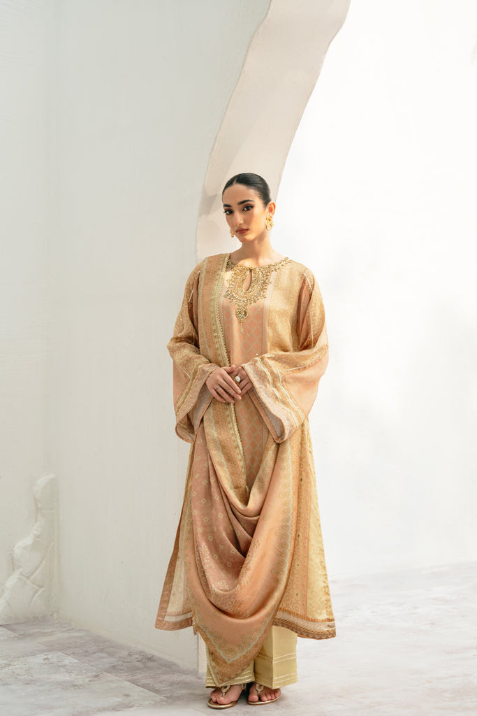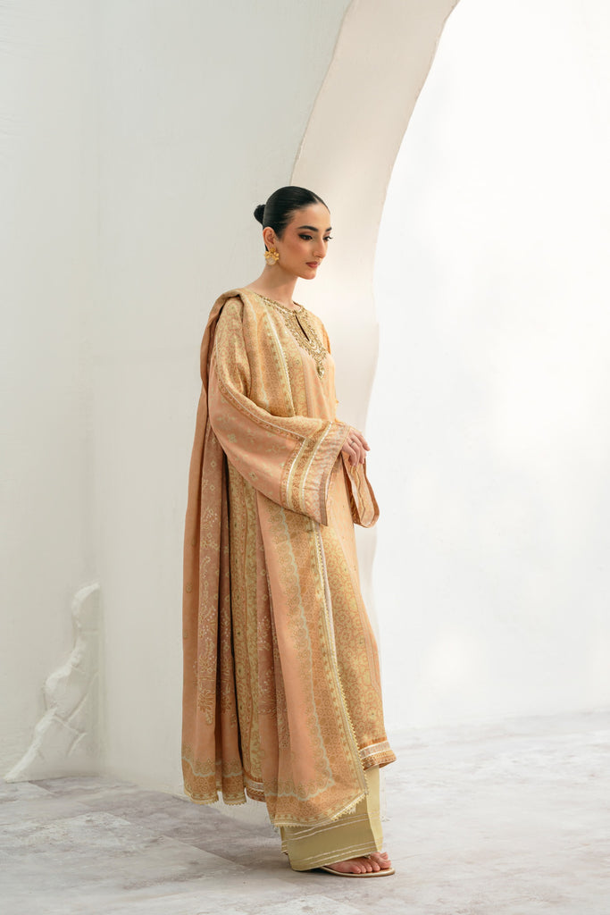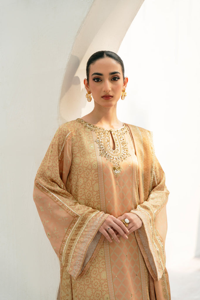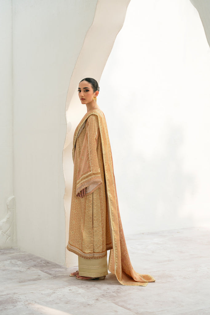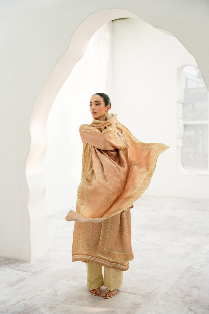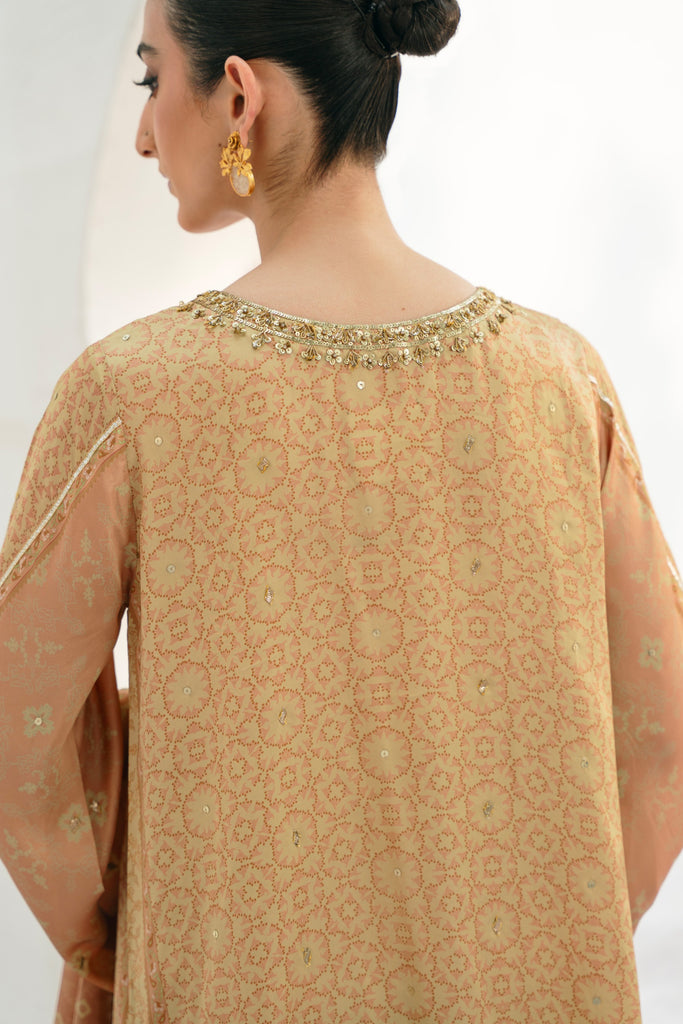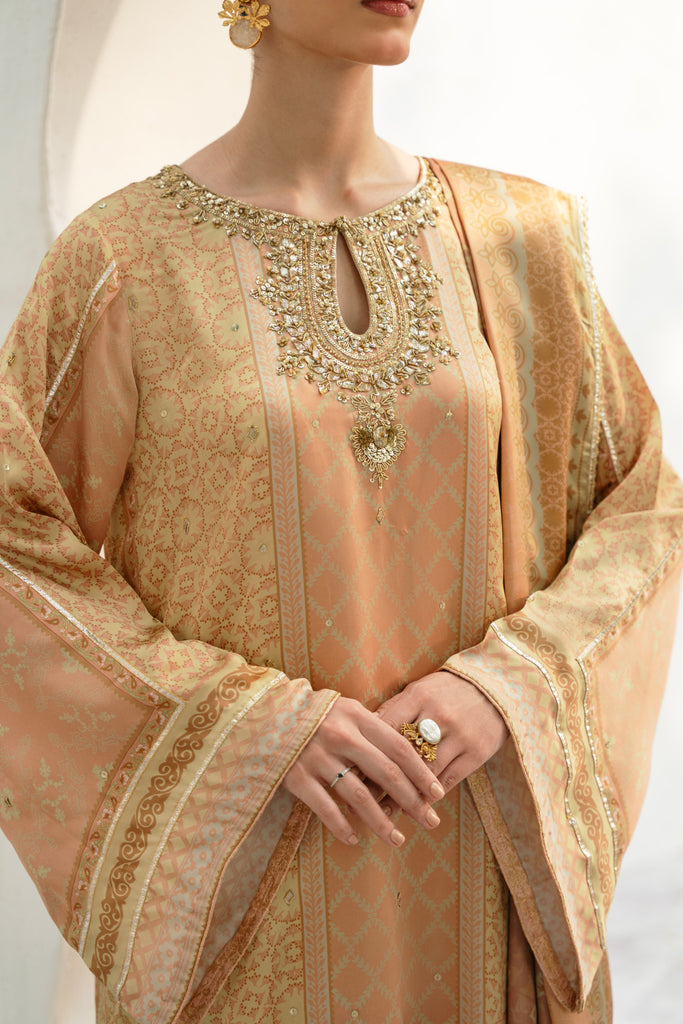 Discover Agha Noor's festive prints created with utmost detailing alongside immaculate tailoring. A canvas of stunning raw silk, is printed with uplifting florals. Enhanced with a gold zardosi handwork neckline with dabka, naqshi, sequins and crystals. Styled with a printed charmeuse dupatta and shalwar as seen.