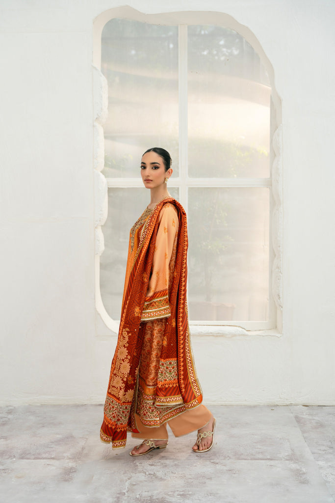 Discover Agha Noor's festive prints created with utmost detailing alongside immaculate tailoring. A canvas of stunning mustard cut from raw silk, is printed with uplifting florals and eye-catching shades of maroon and deep rust. Enhanced with a gold zardosi handwork with dabka, nagshi, sequins and crystals. Styled with a printed charmeuse dupatta and trousers as seen.