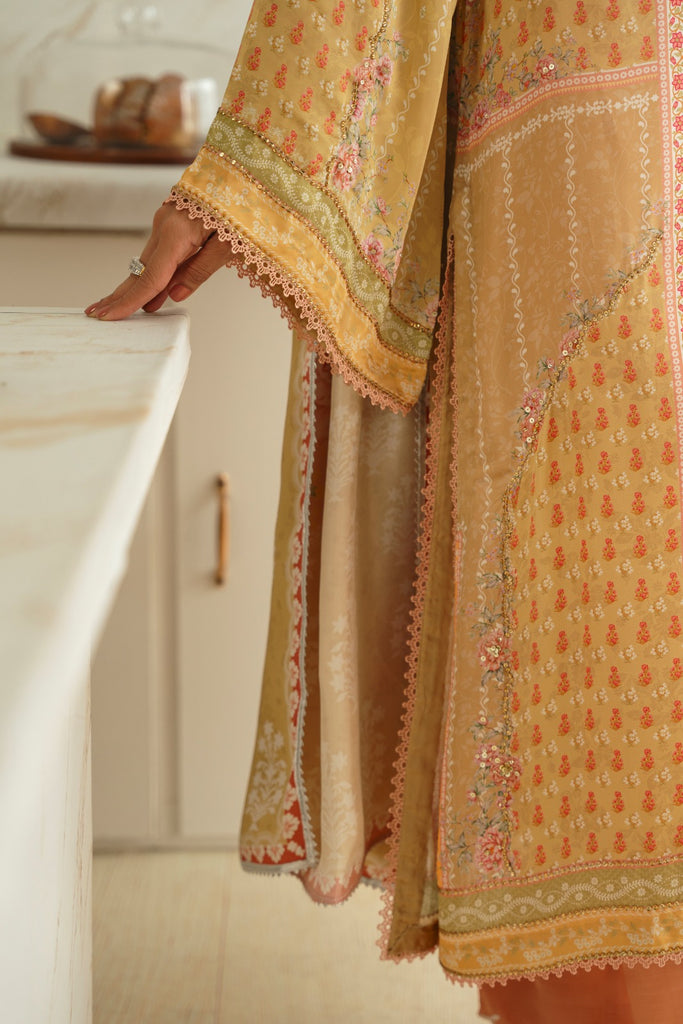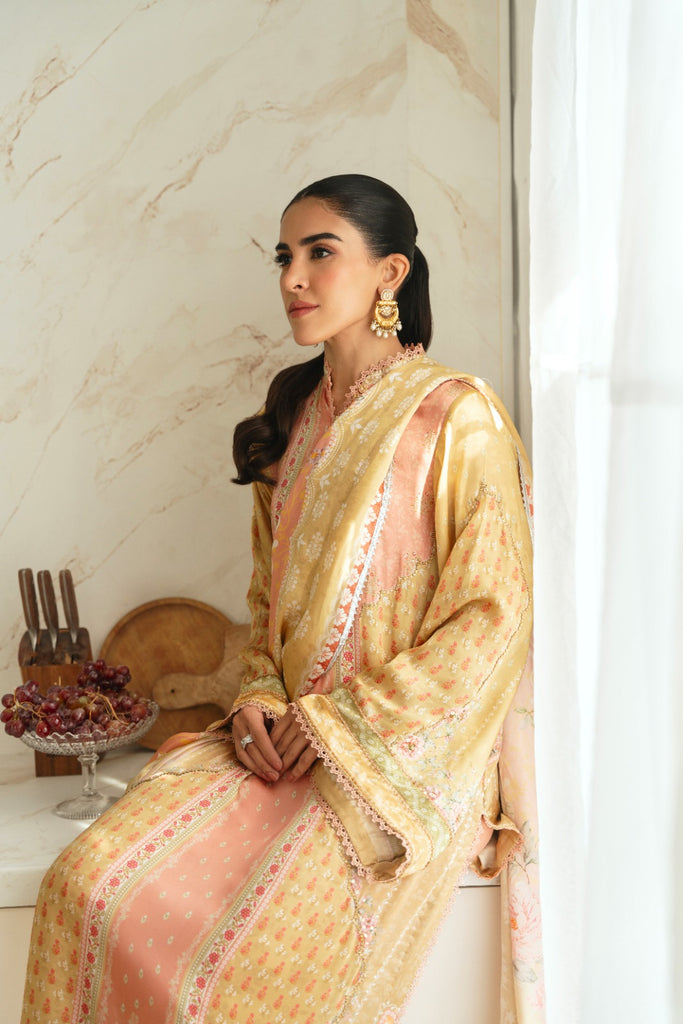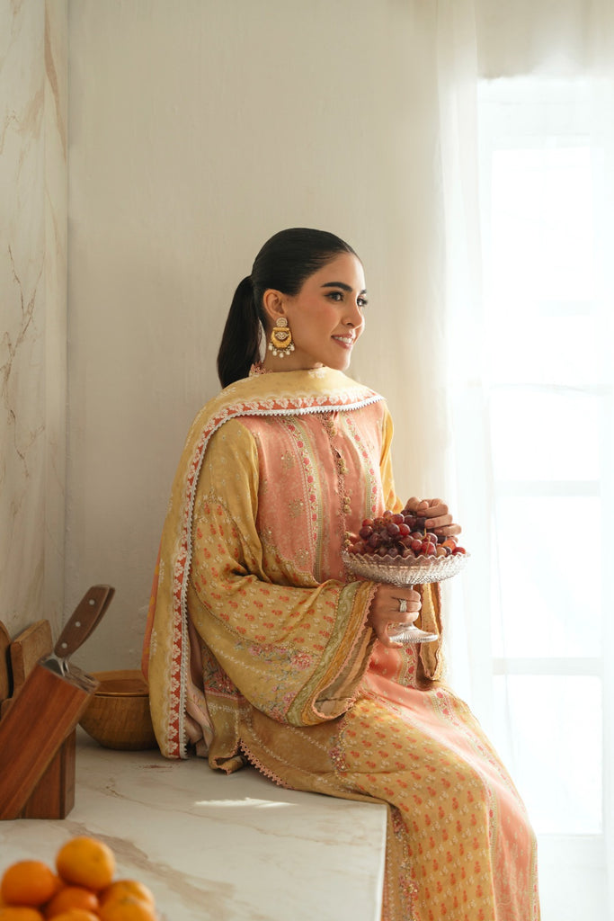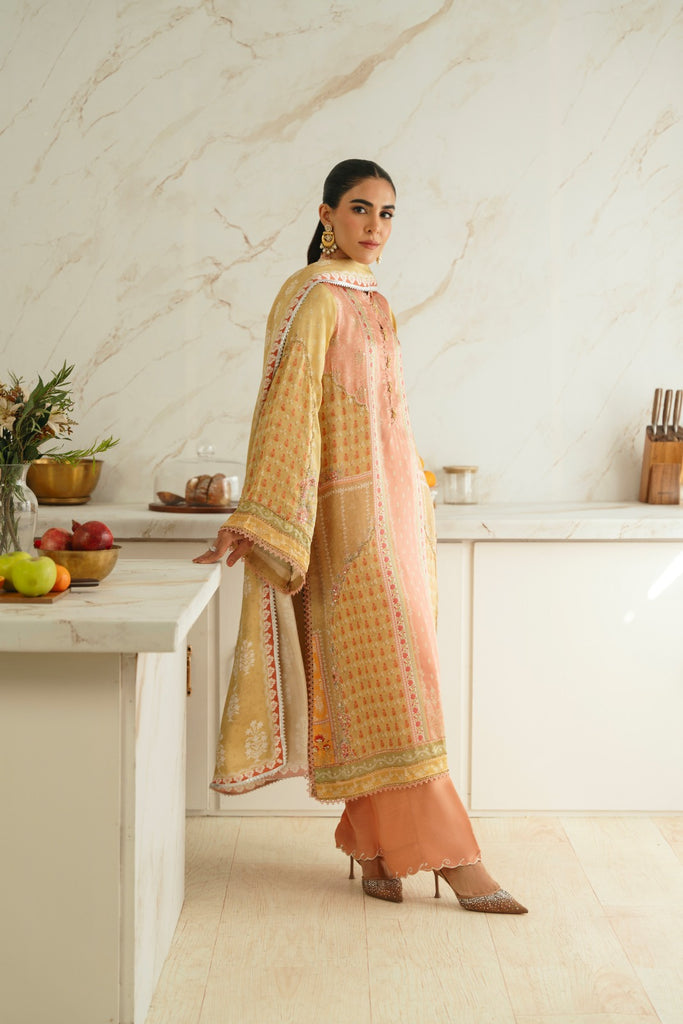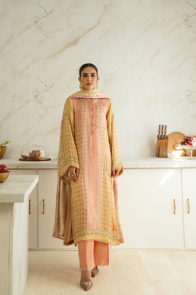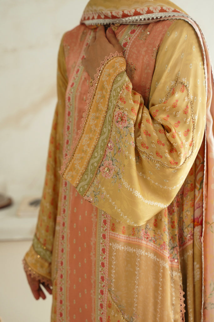 Curated on the finest soft silk base in the beautiful pastel tones. Tuscany Sen is embellished with the most intricate stones. This alluring design is paired with a matching printed charmeus silk dupatta alongside a matching raw silk lzaar as seen adorned with a border on the hem. The length of the long kameez is 48 inches. The beauty of this design is that you can wear it in soirées and daytime gatherings alike.