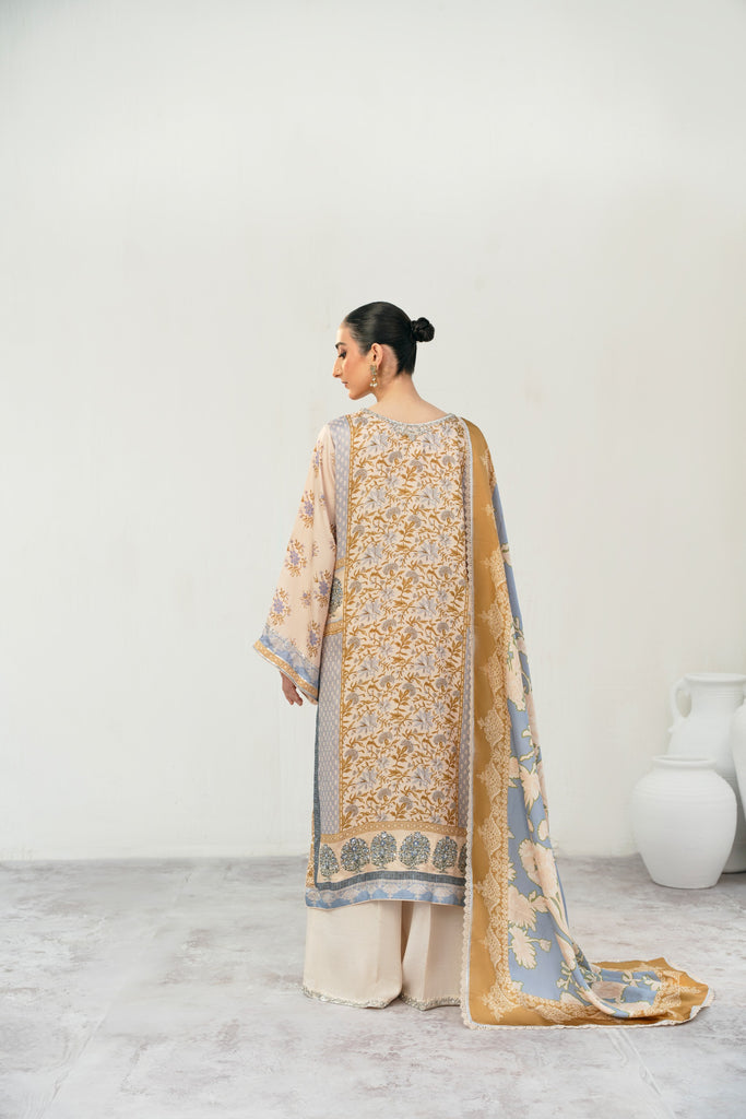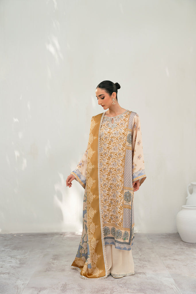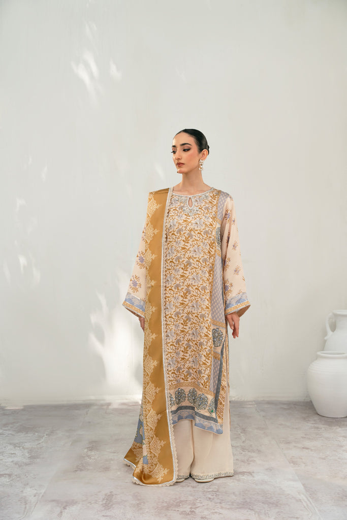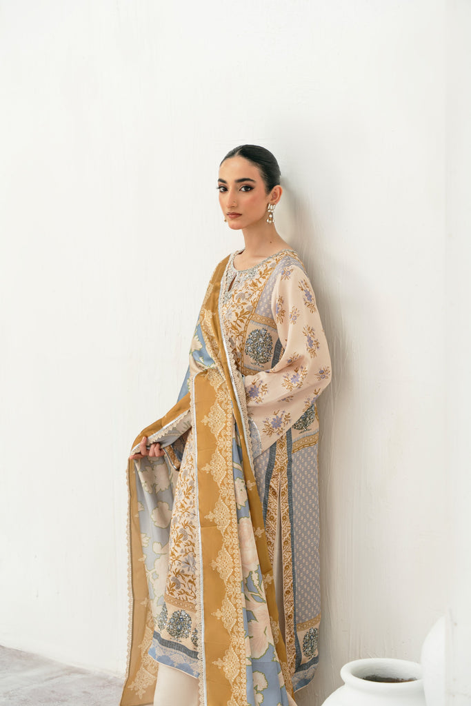 Discover Agha Noor's festive prints created with utmost detailing alongside immaculate tailoring. A canvas of stunning beige from raw silk, is printed with uplifting florals and eye-catching shades of blues and ivory. Enhanced with a silver zardosi neckline handwork with dabka, naqshi, sequins and crystals. Styled with a printed charmeuse dupatta and trousers as seen.