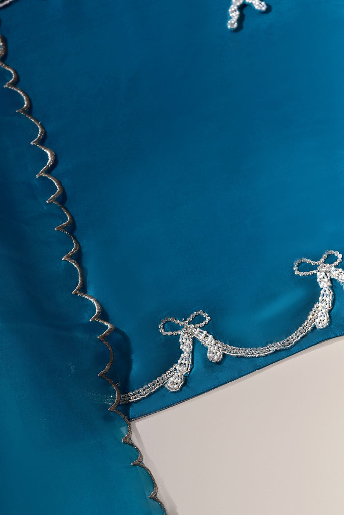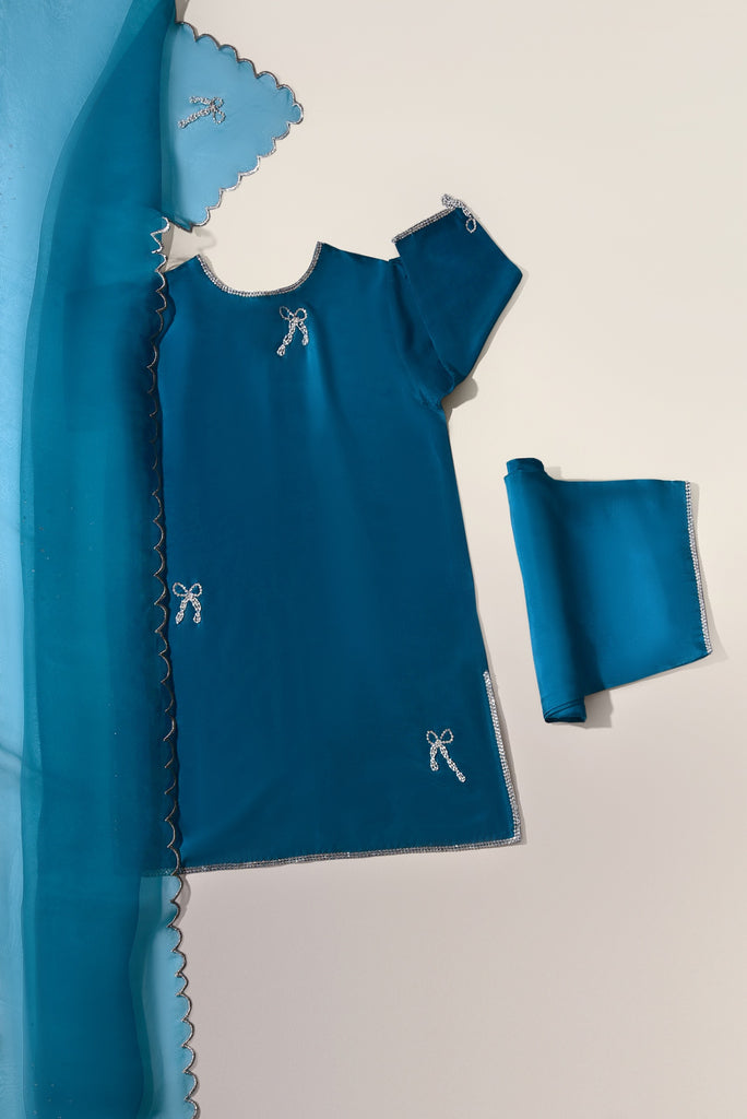 Curated on luscious pure teal blue raw silk with intricate ada/hand details. Styled with a pure soft tissue organza dupatta accentuated with scalloped borders. A beautiful three piece, perfect for festive events. The length of the short kameez is 32 inches.