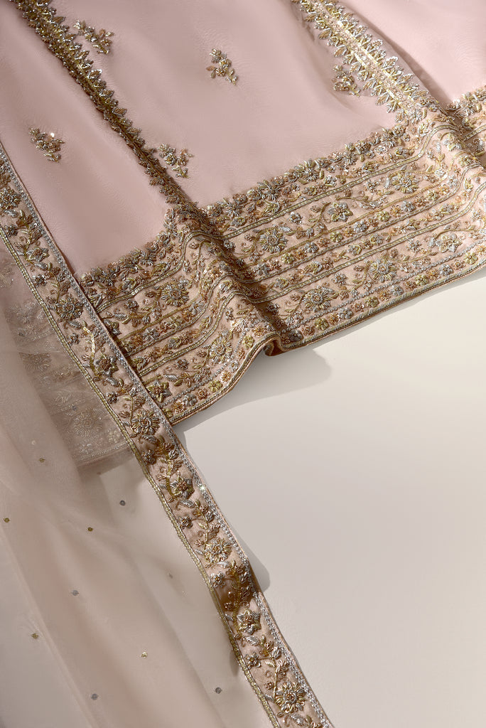 Experience the art of effortless elegance with the ethereal " Nain " ensemble. Offering a traditonal timeless silhouette on pure soft tissue organza, heavily adorned with hand/ada work with dabka, sequins, nug, naqshi and crystals. Paired with a matching pure raw silk Izaar alongside a fully embellished pure soft tissue organza shawl. This alluring ensemble exudes grace and elegance, making it a beloved addition for your festive occasions. The length of the long kameez is 48 inches.