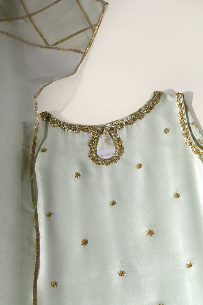Timeless elegance and unmatched details make up for our Saefa ensemble. Curated on pure mint green korean silk adorned with stunning golden handwork details. Styled with an ethereal matching soft tissue organza dupatta alongside matching Izaar to complete this beautiful design. A must have look that can be dressed up or down according to the occasion.