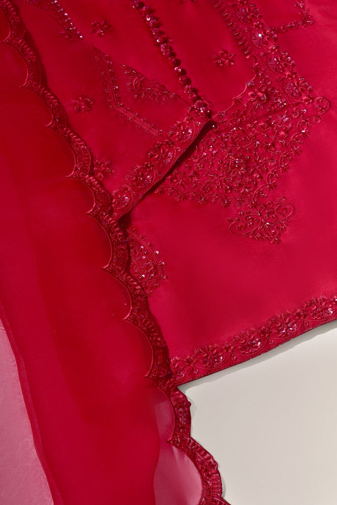 Curated on luscious korean silk with intricate threadwork alonside ada/hand details. Styled with a pure soft tissue organza dupatta accentuated with scalloped borders. A beautiful crimson maroon three piece, perfect for festive events. The length of the short kameez is 32 inches.