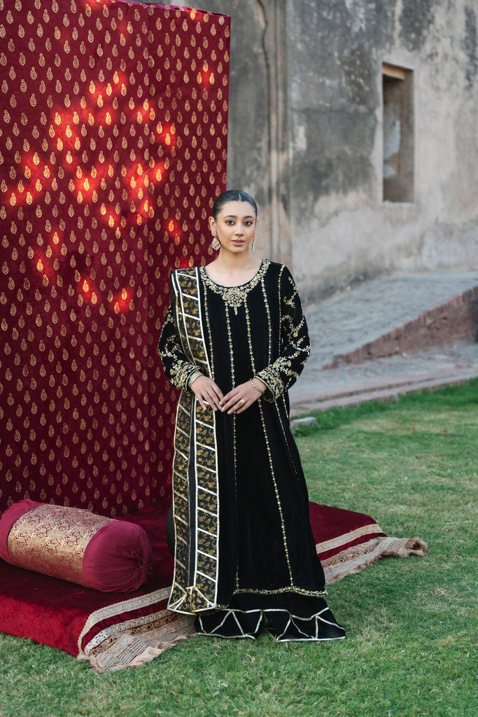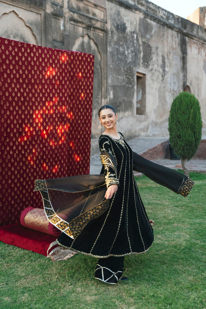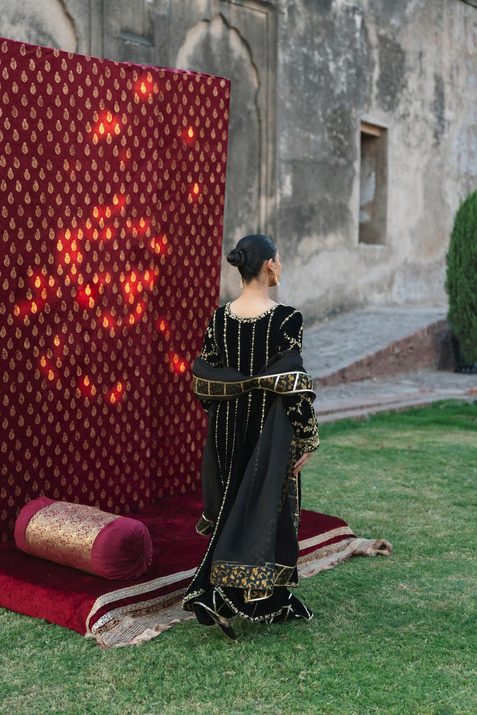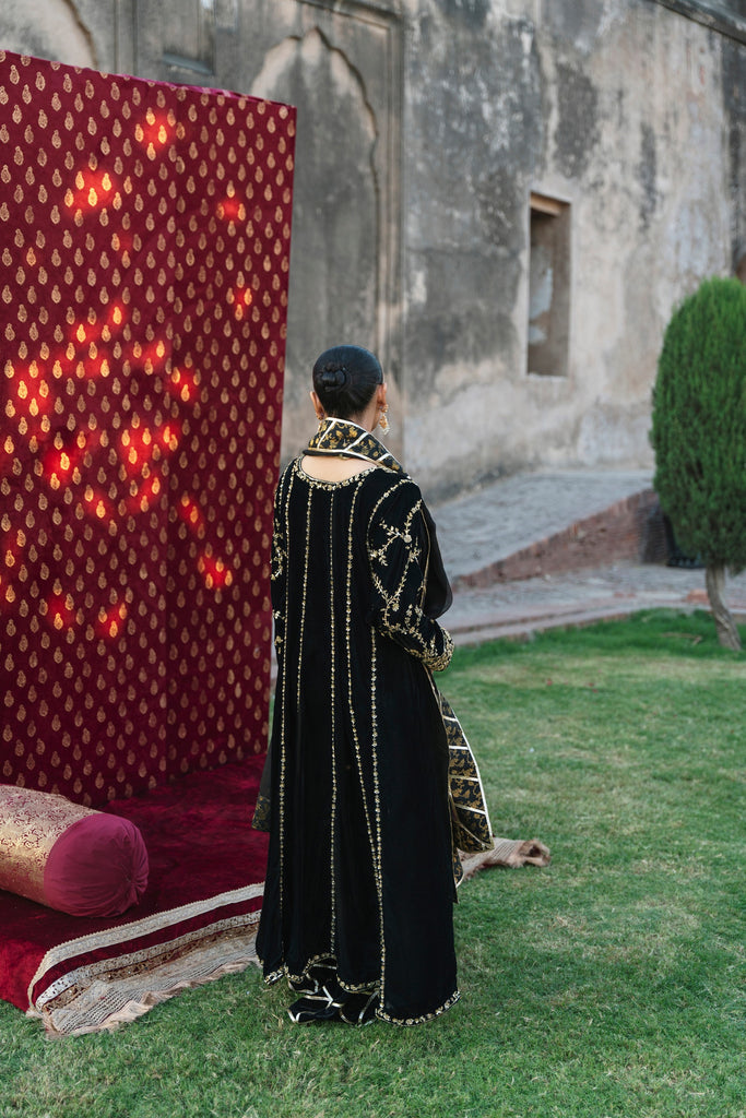 A rich black velvet long kalidaar anchors this beautiful ensemble with confidence, its flowing silhouette traced by vertical trellis of handwork in dabka, nagshi, sequins, nug and moti. This detailed ada work follows the natural fall of the fabric, adding structure and depth to the velvet's plush finish without overpowering its form. A matching velvet izaar, finished with delicate gotah detailing. grounds the look, while an organza dupatta edged with glistening jamawar borders introduces balance in contrast. Together, the elements reflect a carefully curated design rooted in heritage. The length of the long kalidaar is 48 inches.