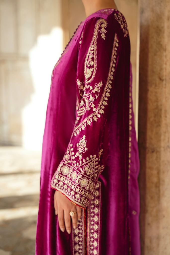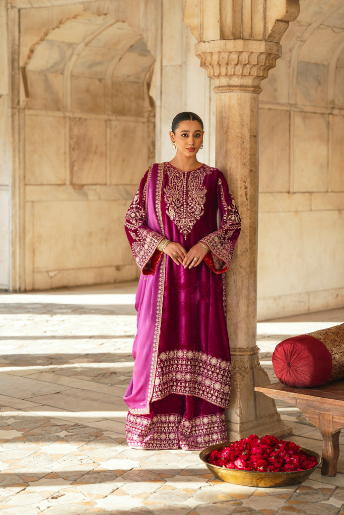 A vibrant purple velvet backdrop comes alive with intricate golden threadwork with gold sequins across a three-piece festive set. Paired with a gleaming shamus silk dupatta featuring a border on four sides, this beautiful ensemble is made for cherished moments. The length of the long kameez is 48 inches.