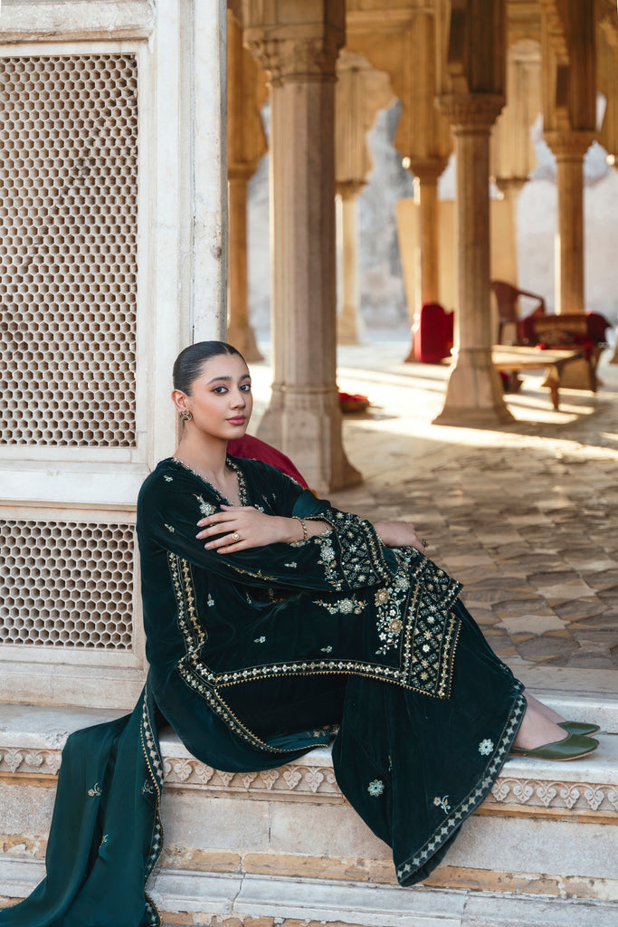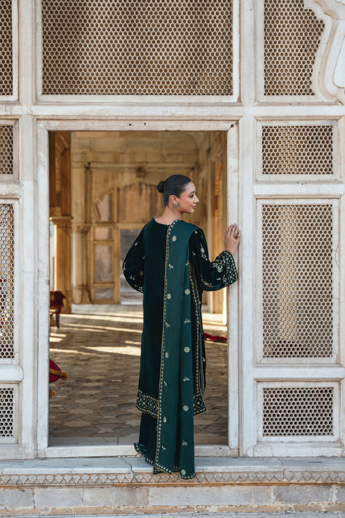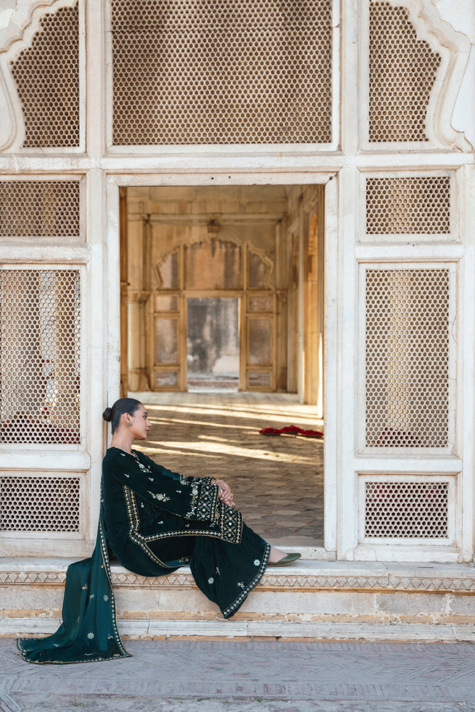 This stunning three piece is thoughtfully curated with intricate details. The mirage of plush poison green velvet canvas with gold tilla and zardosi craftmenship make up for Mahdisa. The soft V-neckline with heavily embellished borders suggest the weighted detailing of heirloom formal wear. Botanical motifs lean towards stylised flora rather than literal blooms, suggesting a folk-driven sensibility, refined for traditional dressing. Styled with a deep poison green silk izaar and silk dupatta embellished with matching borders, creating a poised expression of winter occasion wear. Turn heads this festive season with understated elegance in Mahdisa.