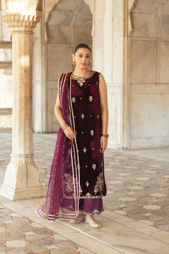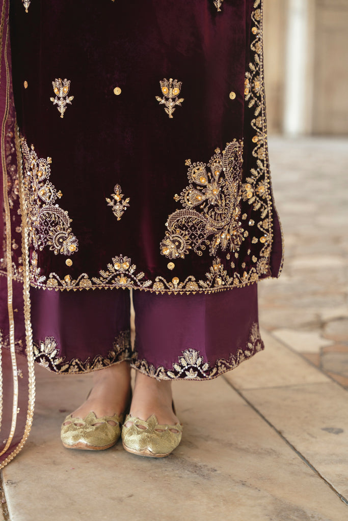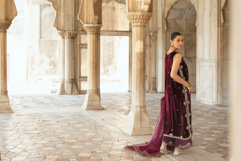 An aubergine-toned velvet kameez with ornate ada work complements a muted purple izaar edged with delicate embellishments anda shimmering organza dupatta. Hand stitched dabka, naqshi and zari add texture and dimension, making this Agha Noor design a showstopper for the season.