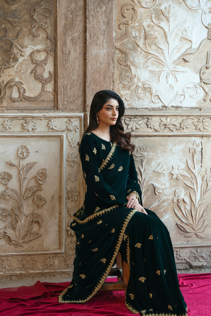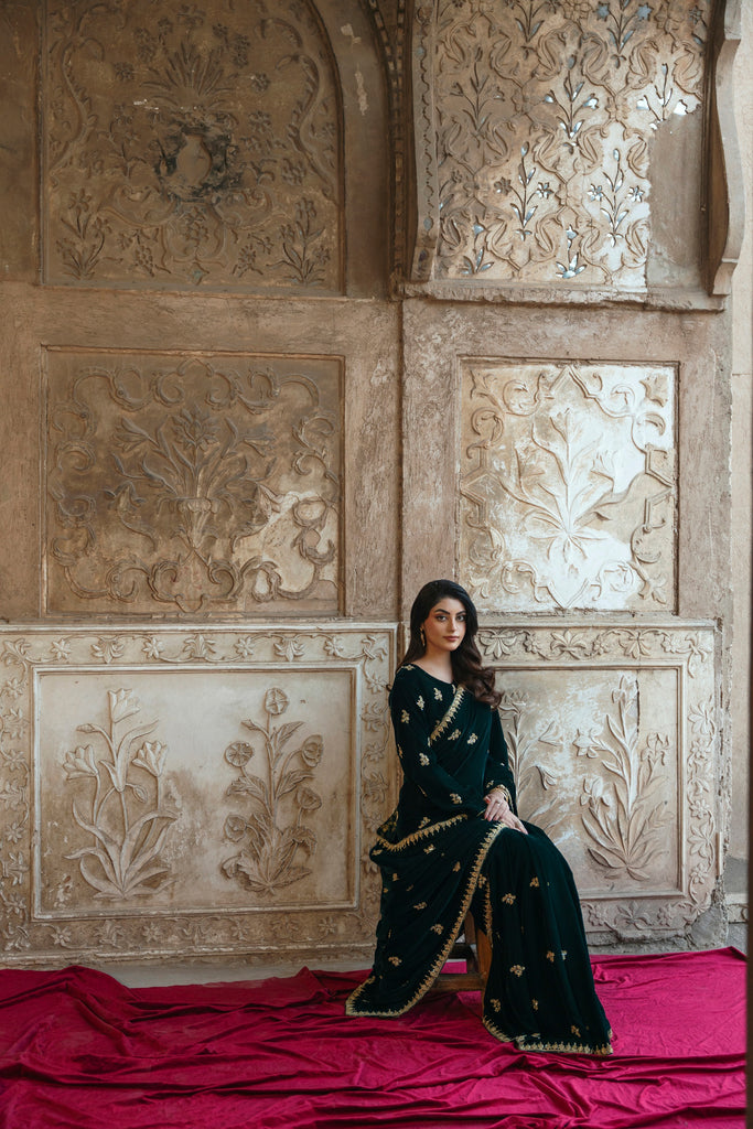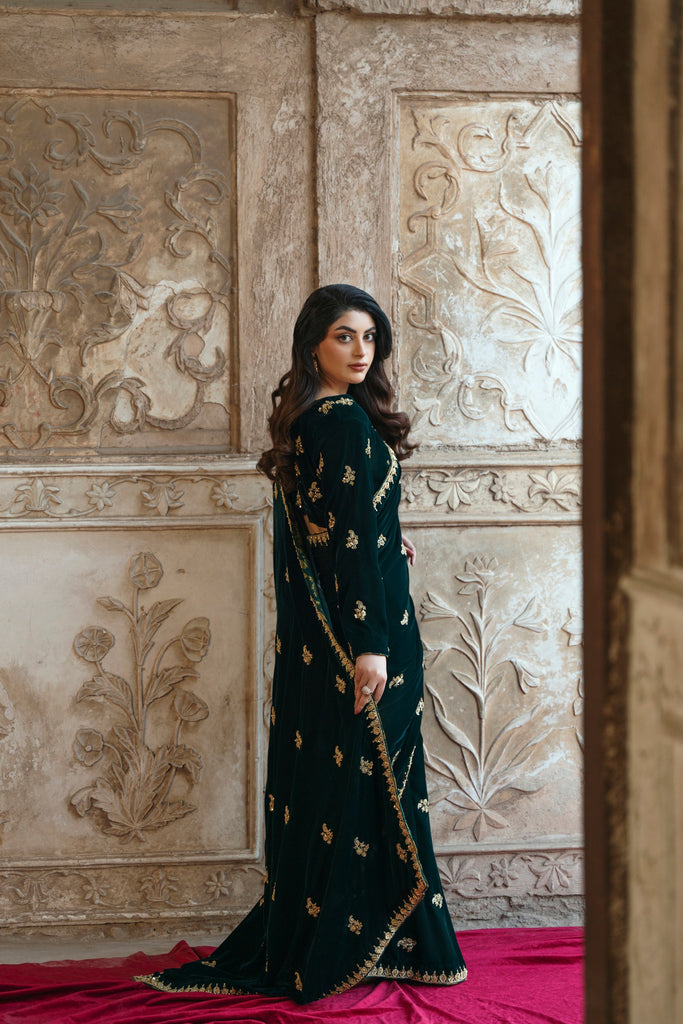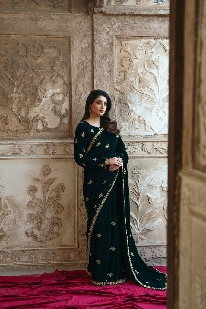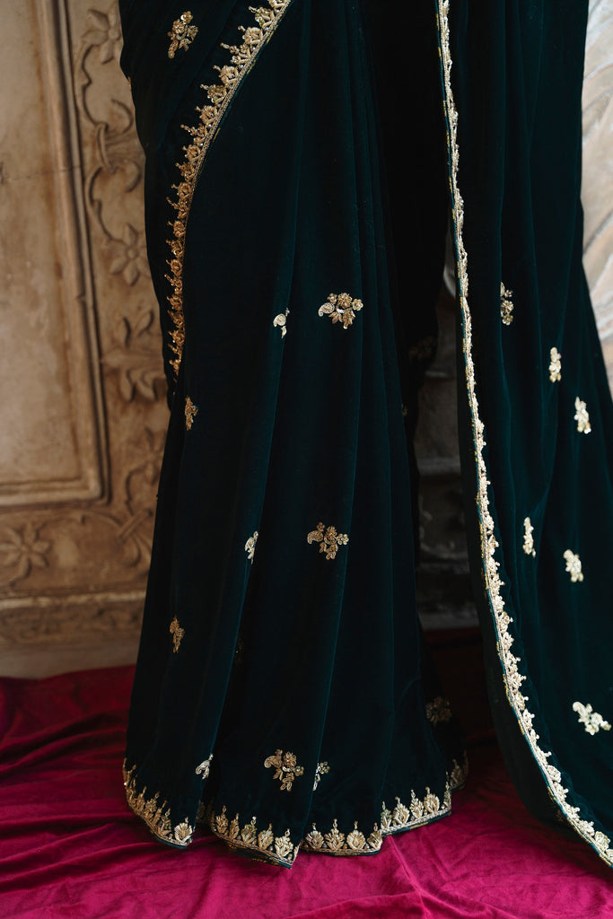 Draped in plush forest-green velvet, this sari leans into drama through detail, where softly gleaming zardozi florals scatter across the surface like ornamented constellations. The richness of the fabric holds warmth beautifully, making it especially resonant for winter wedding celebrations, where the evening air is cool and the atmosphere charged with anticipation. The kind of sari that allows you to move through the gathering with ease, presence anda sense of occasion that feels instinctive rather than performed. It's a look that feels both grounded yet undeniably memorable. This alluring ensemble exudes grace and elegance, making it a beloved addition for your festive occasions.