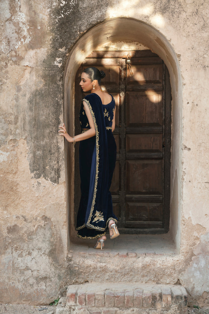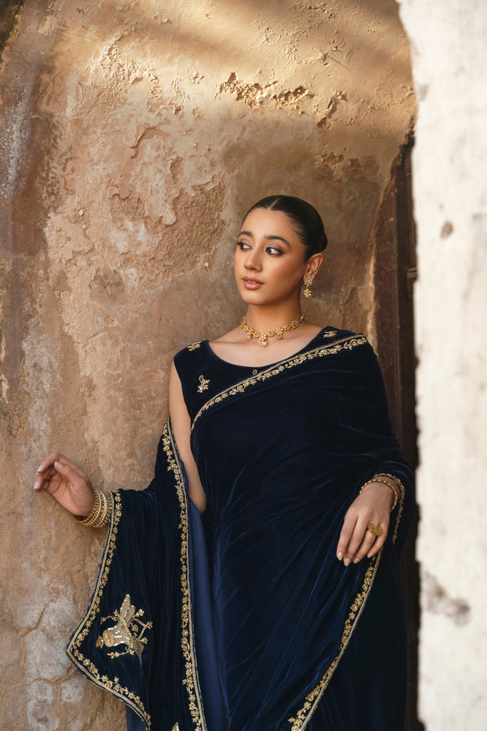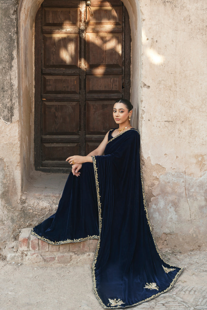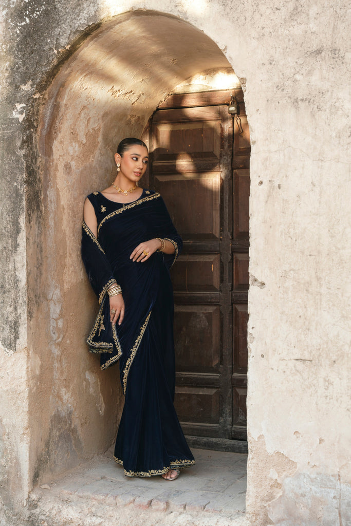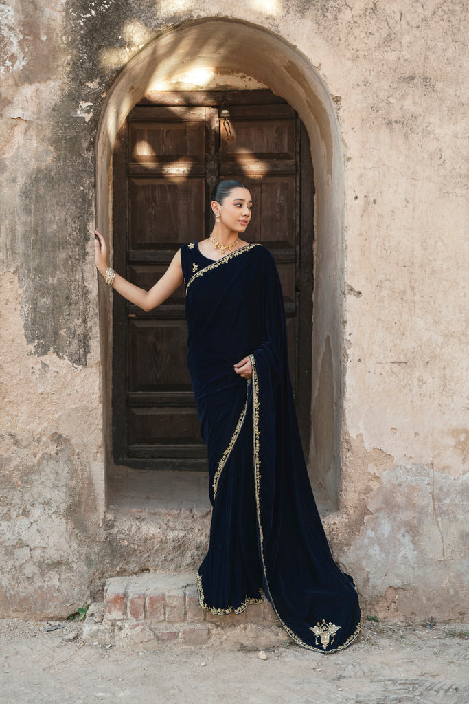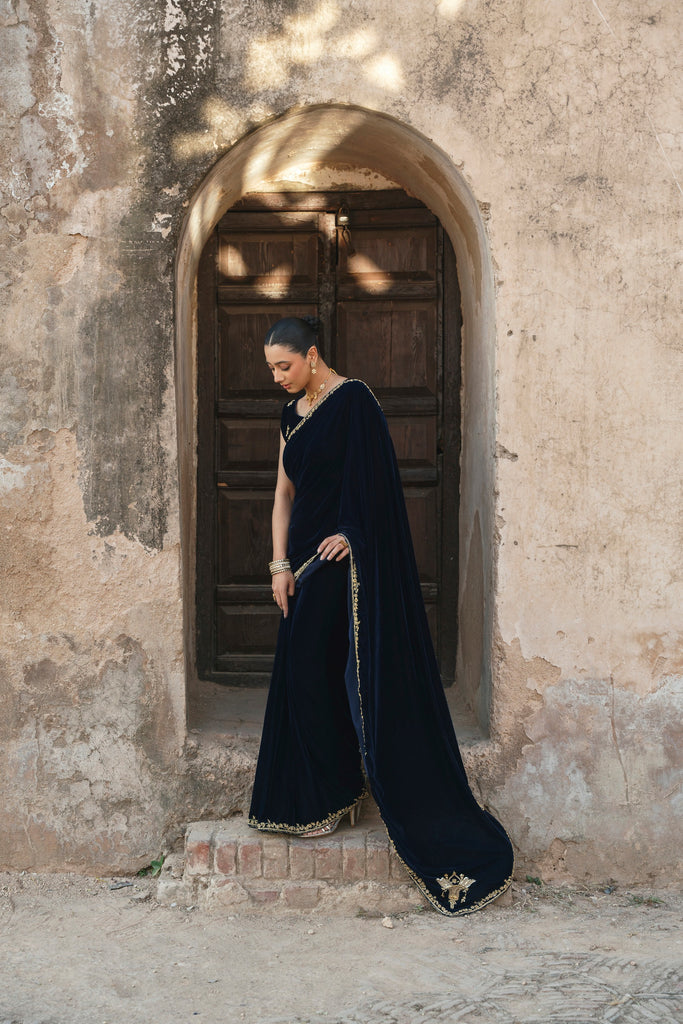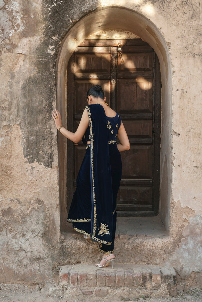 A crisp winter soirée finds its match in this midnight-blue velvet sari, where gold hand/ada handwork runs along the border with deliberation. The blouse, scattered with fine blooms, introduces softness without diluting the impact of the velvet's depth. Eight yards of luscious pure velvet and a silk blouse. This gorgeous design will be your perfect choice for festive occasions.