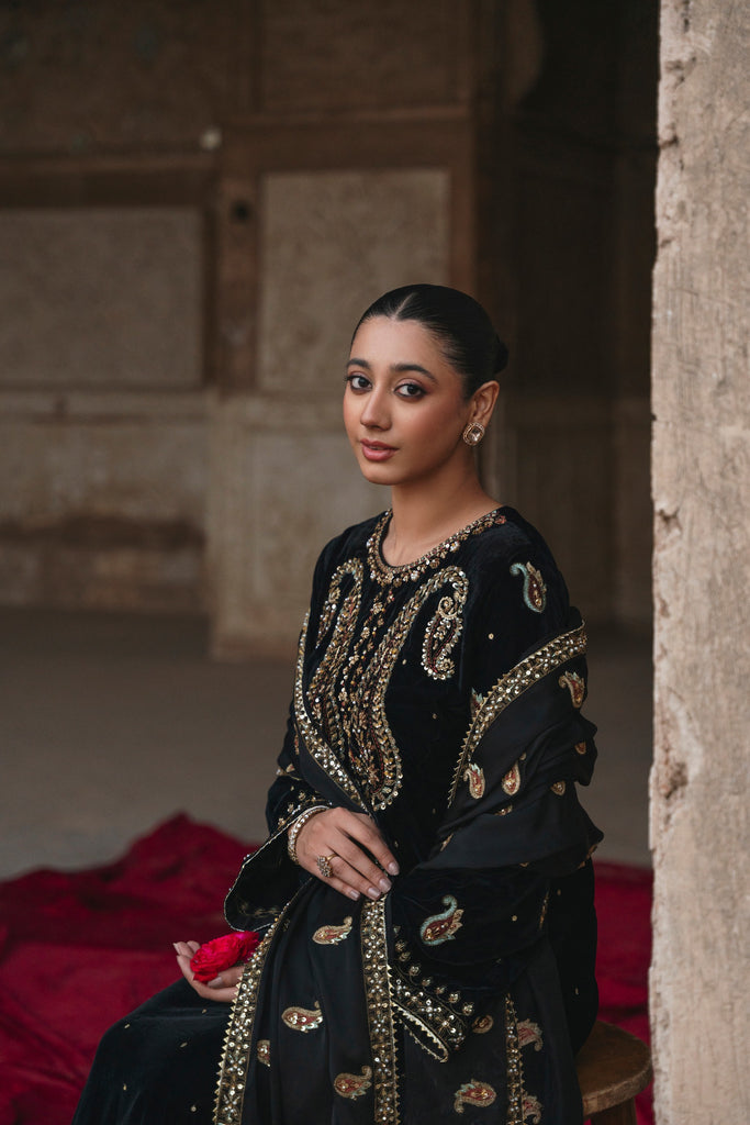 This beautifully curated velvet three piece is inspired by the mughal era artistry, defined by paisley medallions with intricate gold zari alongside hand/ada zardozi craftmenship across a deep midnight canvas. The border on the hem is articulated through ornate florals, recalling the refinement of historic textile margins and traditional shawl patterns. Intentionally designed in both motif placement and proportion, this beautiful design is perfect for festive winter evenings, where heritage reference and thoughtful detailing shape the aesthetic rather than fleeting trend.
