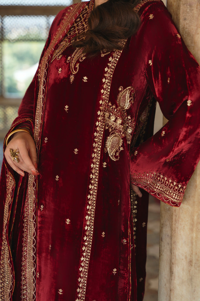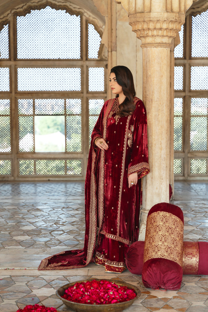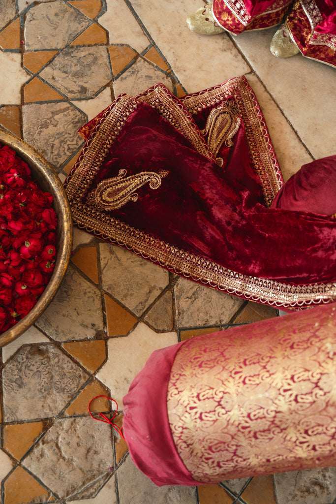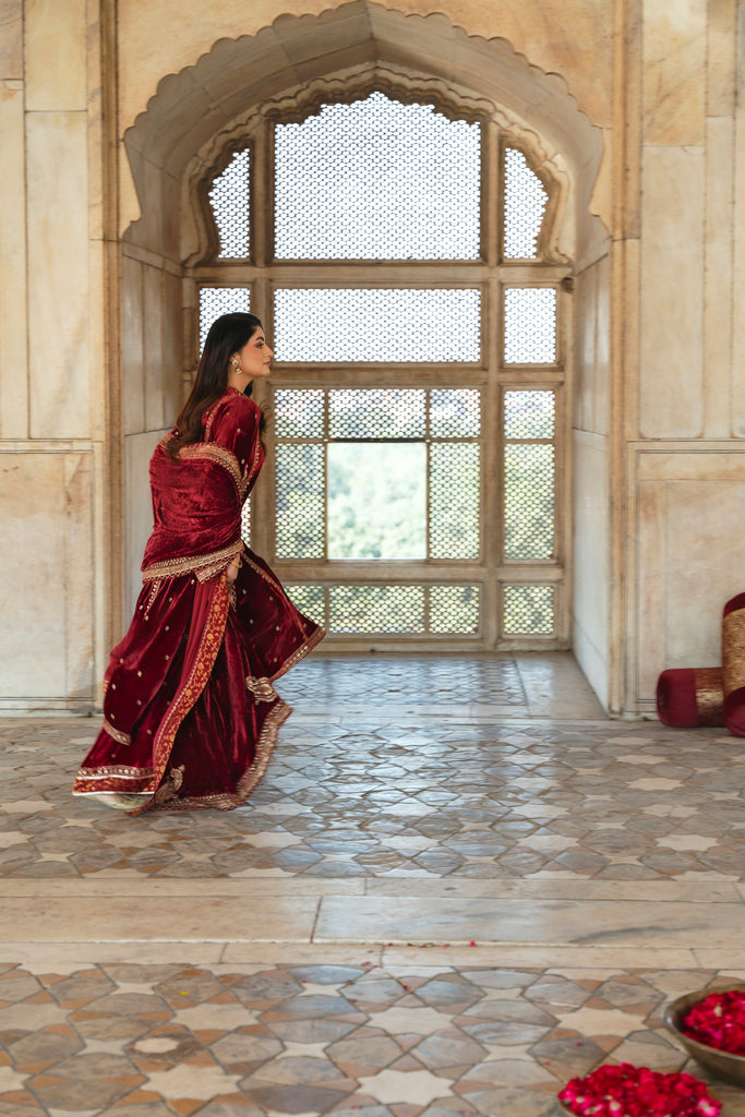 This maroon hued velvet canvas as a three-piece, set shines with golden tilla work and scattered sequins, catching the light with every turn. From crisp winter evenings to candlelit qawwali fêtes, it's destined to become your favourite pick for every wedding celebration. The length of the long kameez is 48 inches.