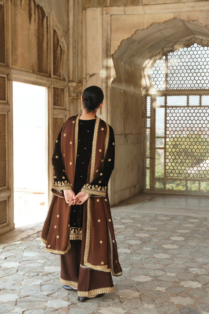 A dark espresso velvet choga is heavily adorned with rich gold dori elements. If you like subtle elegance, this versatile look is for you, the look is complimented with matching silk Izaar and shamus silk dupatta featuring gulab boti's alongside a border on four sides as seen. The length of the Roshan choga is 45 inches.