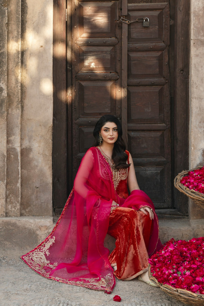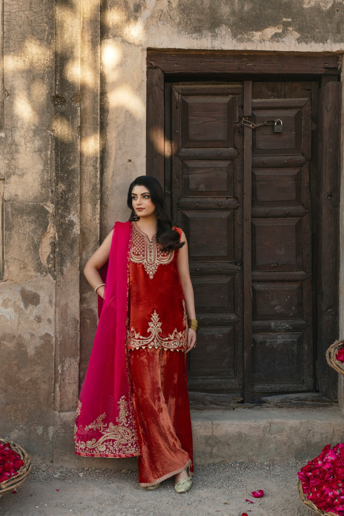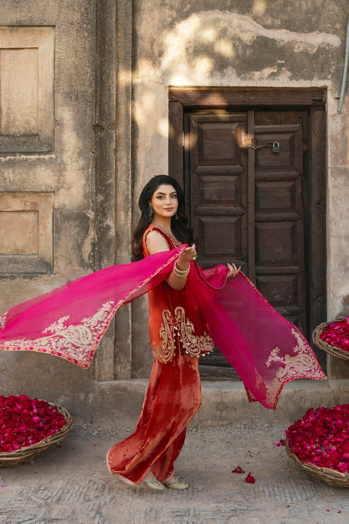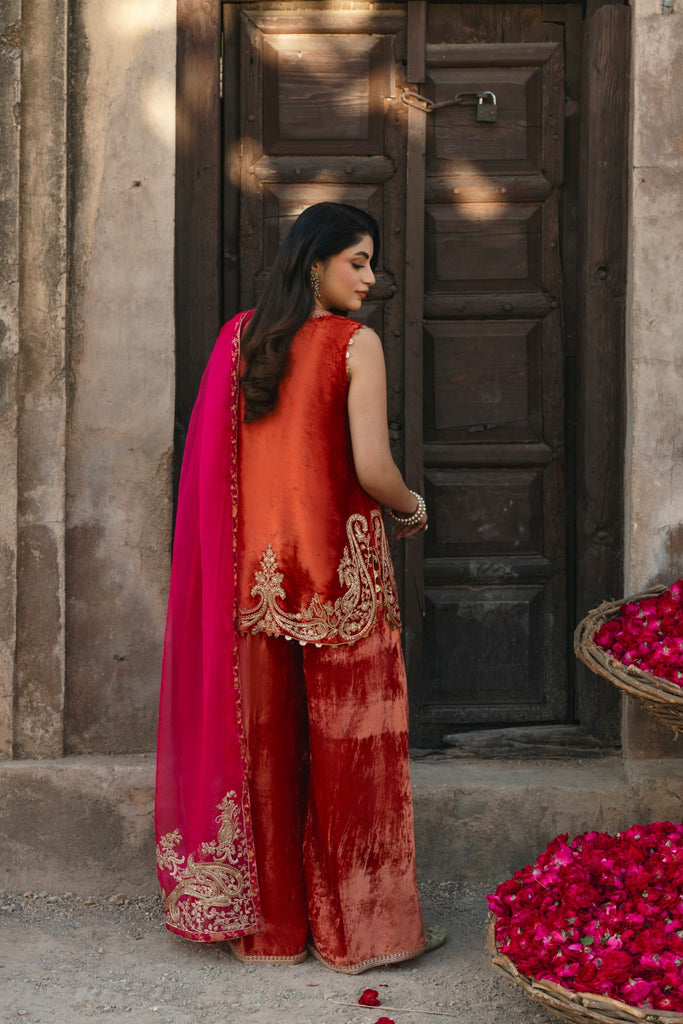 Glistening paisley threadwork lights up a short round-hemmed, burnt-orange velvet shirt with a matching velvet lzaar, bringing elegance to the winter festive season. A raspberry-hued organza dupatta, finished with matching tilla work and jamawar edging, completes the look. The length of the short kameez is 32 inches.