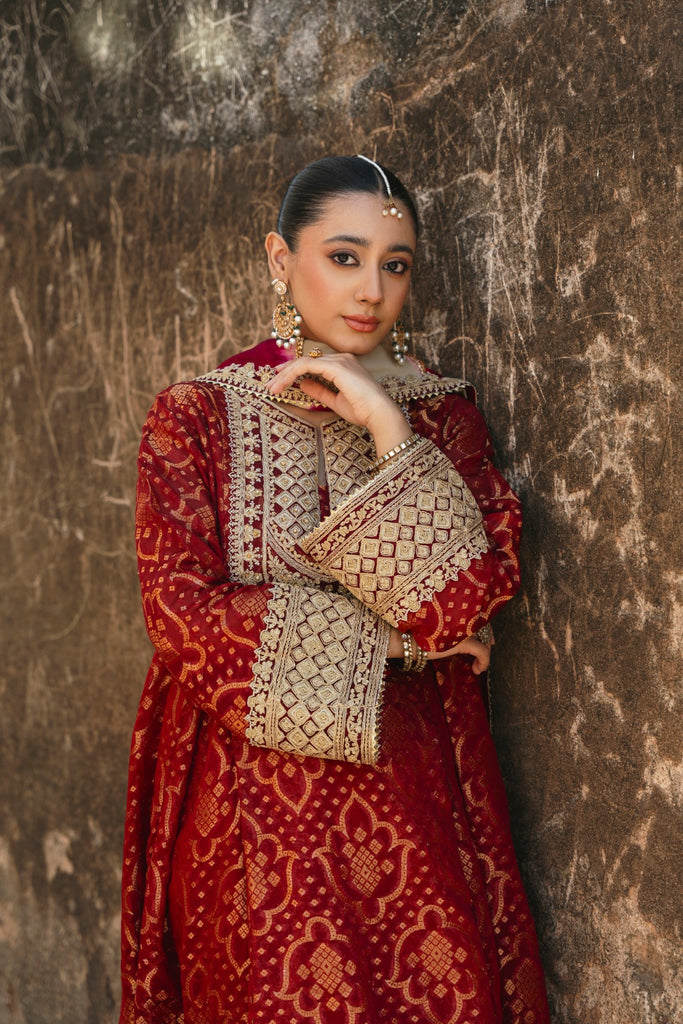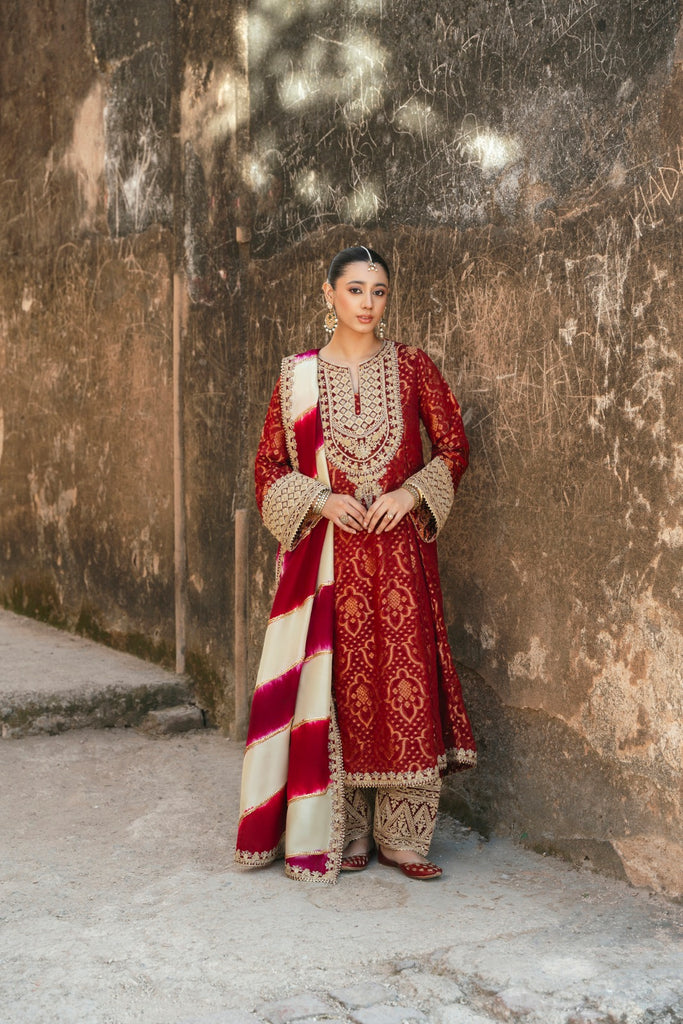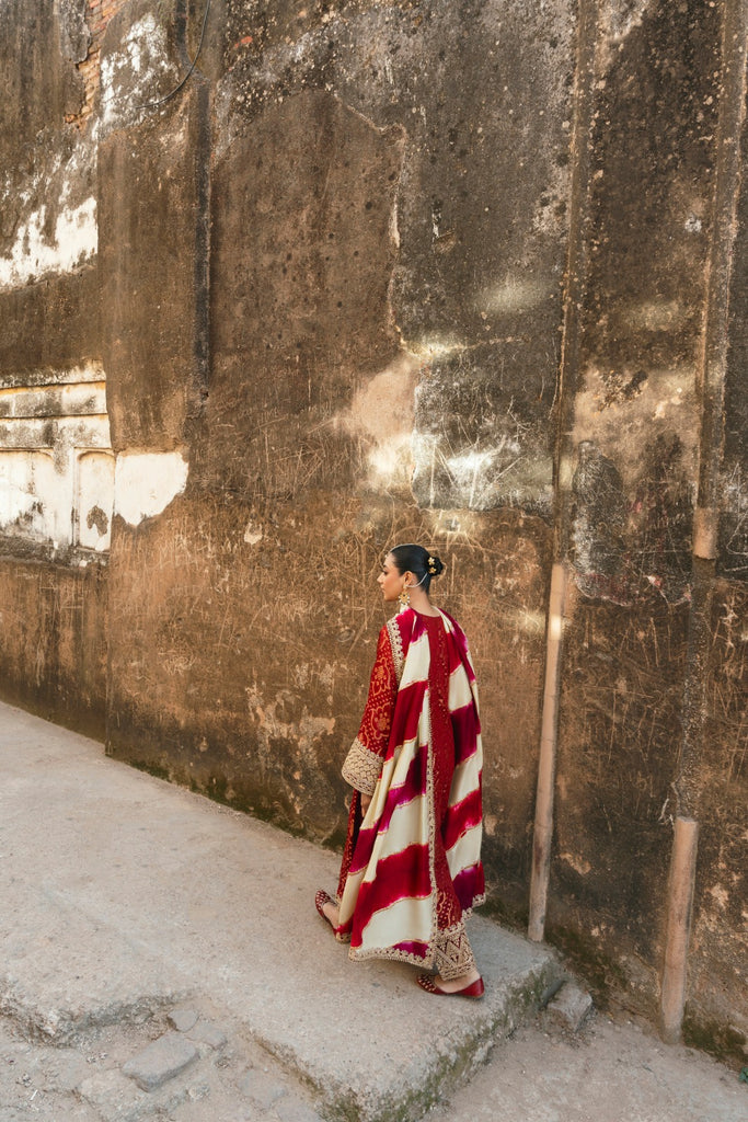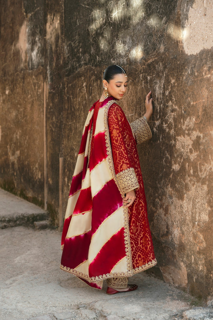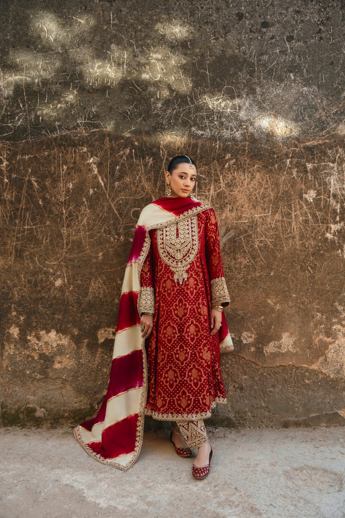 Heavily embellished choga style, intricate zari ari and a glistening crimson jacquard canvas come together with an unmistakably old-world charm. The accompanying silk dupatta presents a striking diagonal, bandhani-inspired colour play: alternating ivory and crimson panels lined with fine gota edging that sharpens each transition. Paired with a heavily worked shalwar, the look balances decorative depth with disciplined refinement. This alluring ensemble exudes grace and elegance, making it a beloved addition for your festive occasions.
