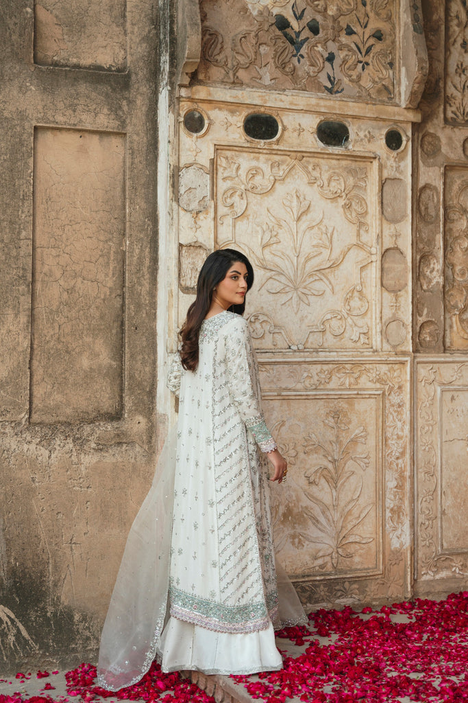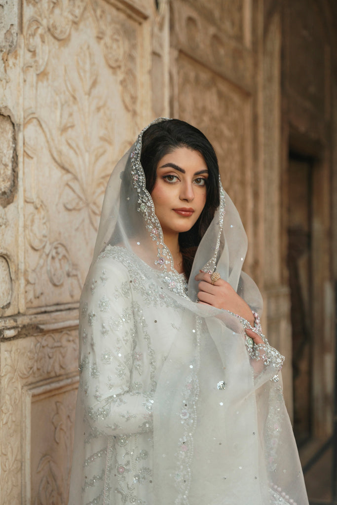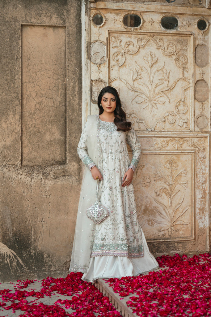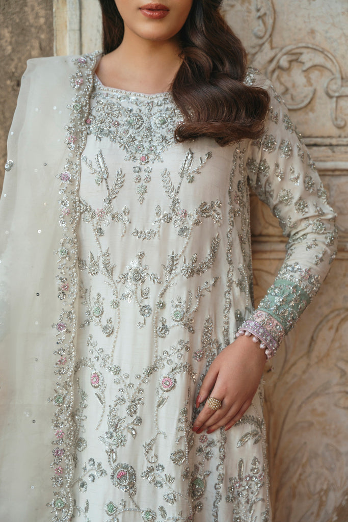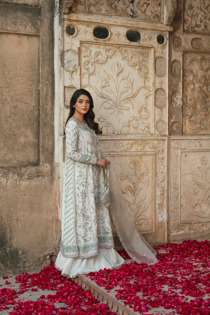 A luminous ivory Korean silk canvas carries intricate silver zardozi flora in a composition that feels both ornate and intentional. The hand/ ada work unfolds in a vine-like narrative, offset by cotton candy pink borders and pastel jade tones with powdery lilac accents that temper the shimmer. These multi-hued hems add structure to the silhouette, creating a balance between softness and form. Finished with a coordinating potli, this is a wedding wear look that feels polished, embodying a tenderness that is as graceful as it is celestial. Styled with a matching korean silk skirt anda pure organza dupatta with an intricate hand scalloped border on four sides. This alluring ensemble exudes grace and elegance, making it a beloved addition for your festive occasions. The length of the long kameez is 48 inches.
