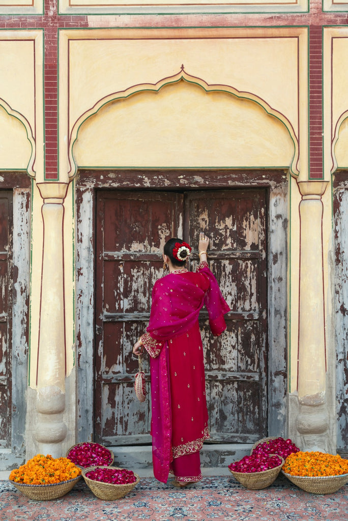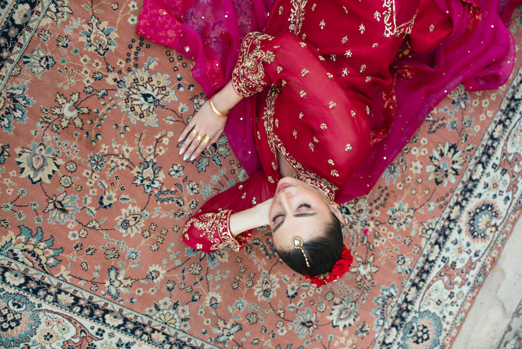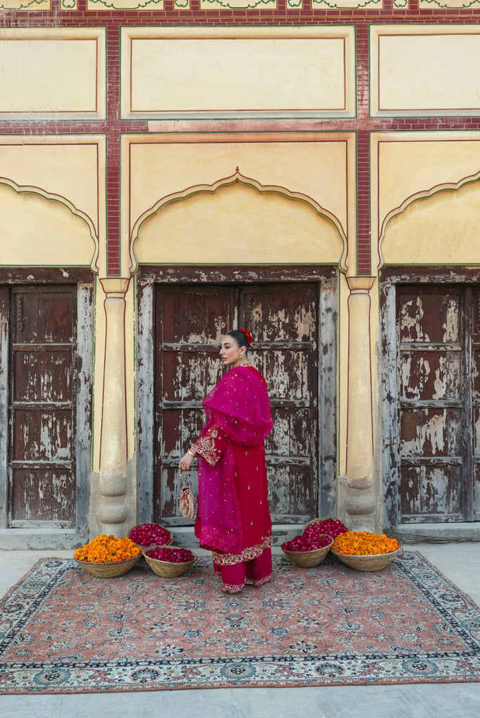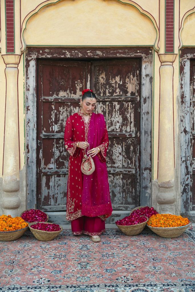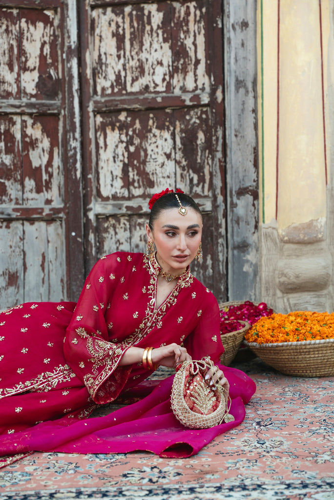 Curated on the finest soft tissue pure organza in the beautiful jewel tone of ruby. Bano Begum is adorned with the most intricate, gold Ada/ handwork of dabka, naqshi, sequins, moti and katori nug, done by our expert artisans, painstakingly taking upto 400+ hours. This design is paired with a contrasting deep magenta pure soft tissue organza dupatta featuring sequins chaath and an embellished matching lzaar as seen. The length of the long open kameez is 48 inches. The beauty of this design is that you can wear it in Mehndi, Nikkah and Baraat events alike.