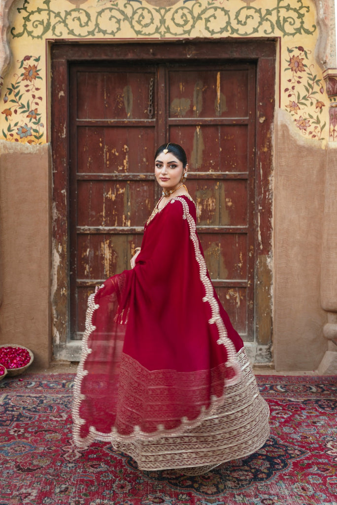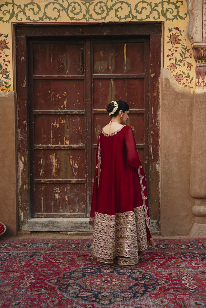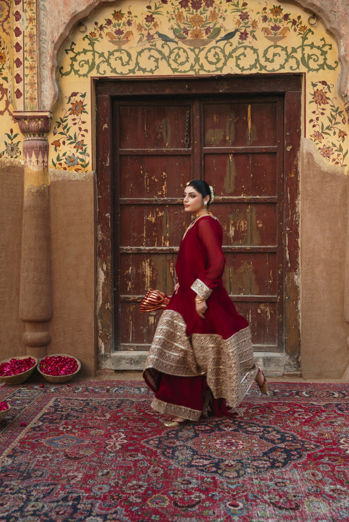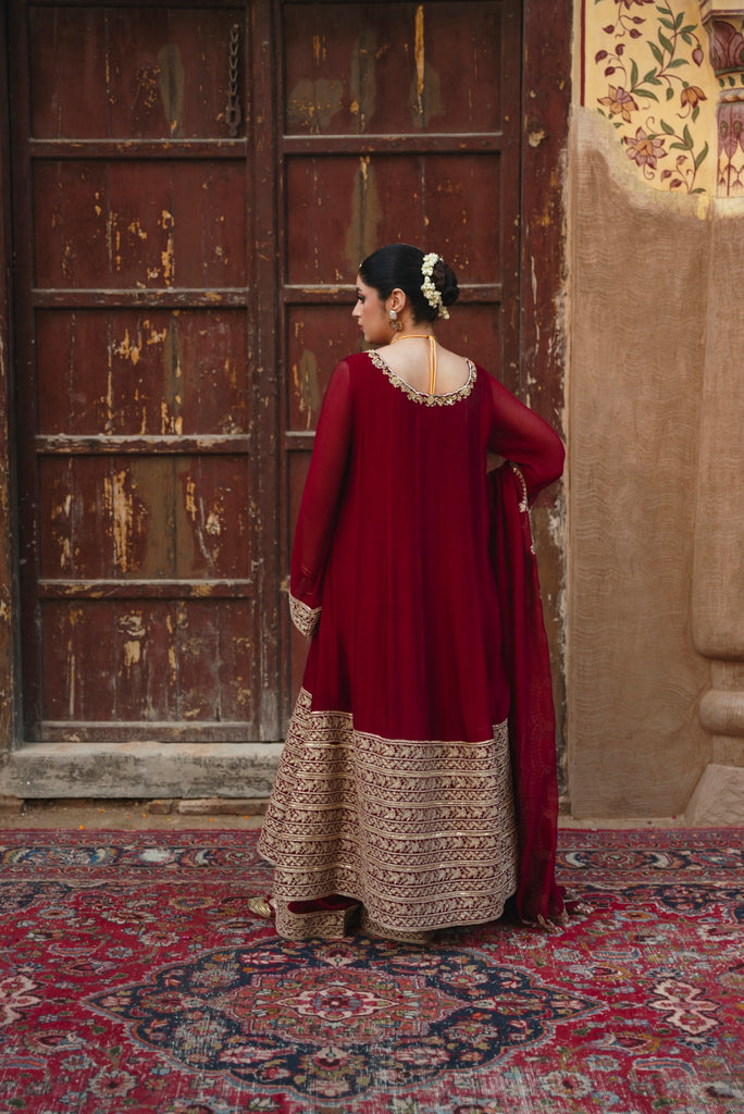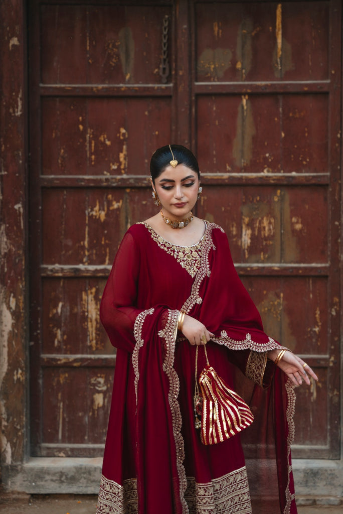 Curated on the finest handloom cotton net beautiful jewel tone of crimson maroon. The Begum Gulab kalidaar is heavily embellished with the most intricate, gold Ada/handwork of dabka, naqshi, sequins, moti and katori nug, done by our expert artisans alongside gold zari borders as seen. This design is paired with a matching dupatta & matching lzaar as seen adorned with a border on the hem. The length of the long kalidaar is 50 inches. The beauty of this design is that you can wear it in Mehndi, Nikkah and Baraat events alike.