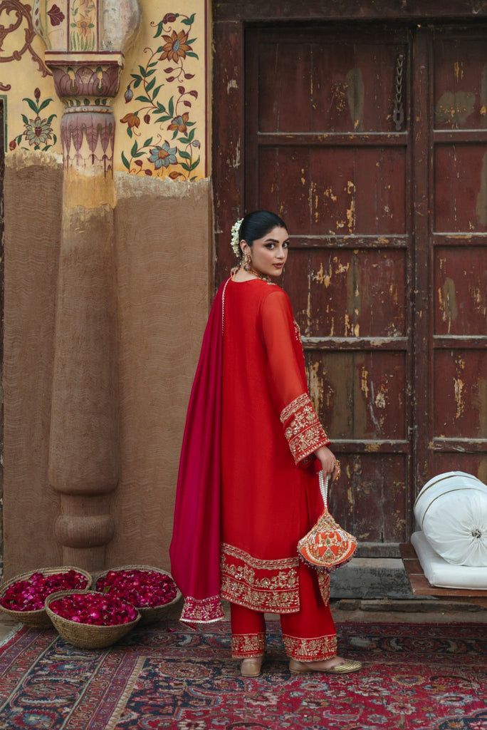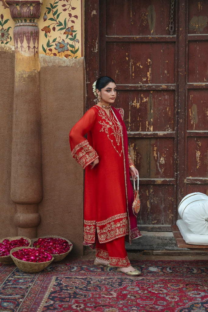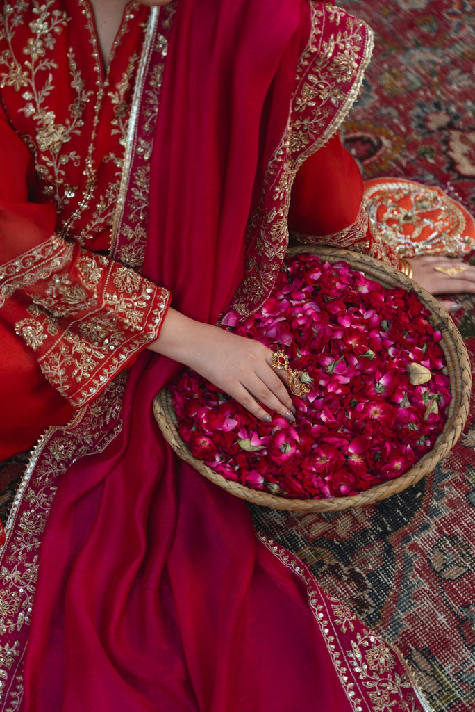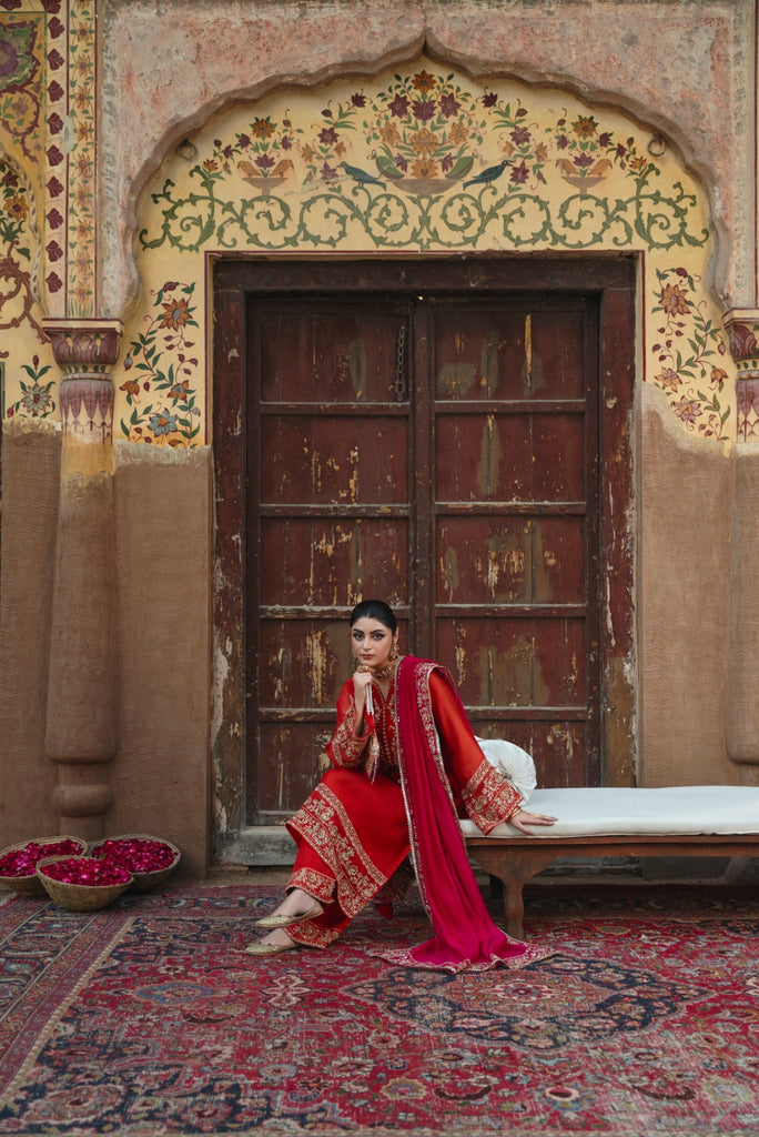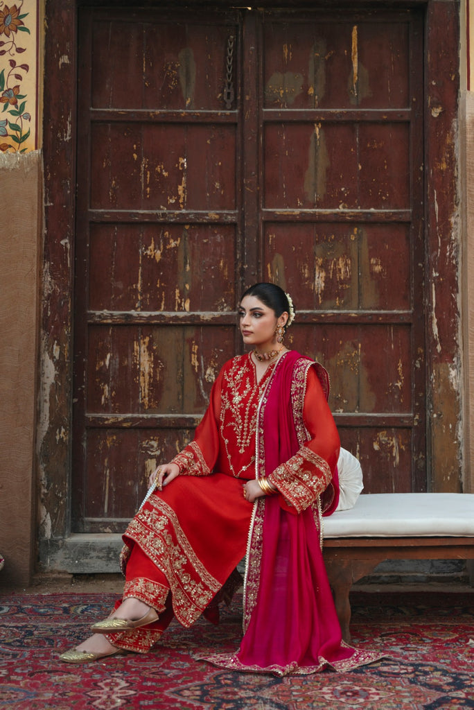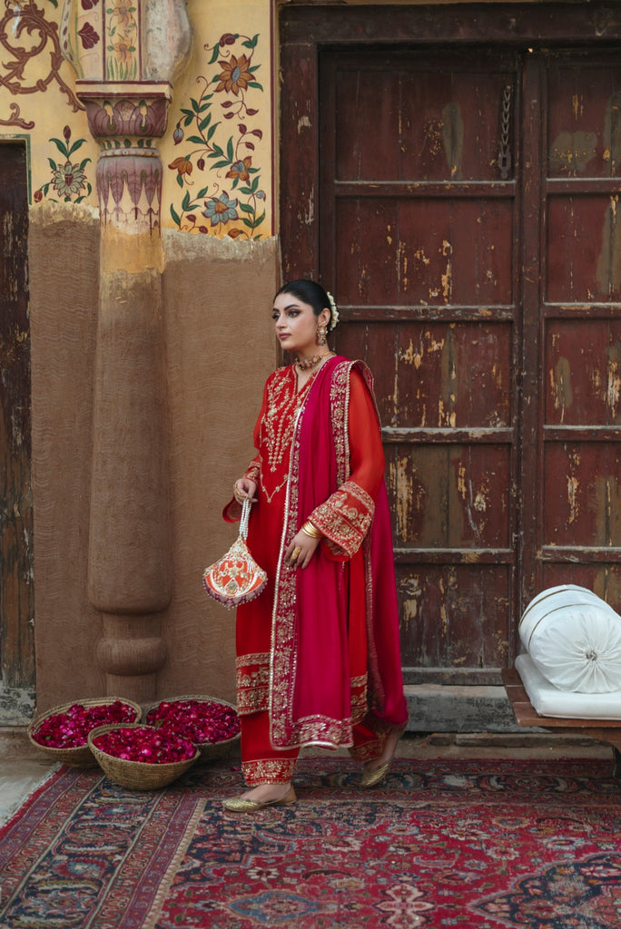 Curated on the finest pure raw silk 60 gms in the beautiful festive shade of burnt orange. Gur Mahal is embellished with the most intricate details. This alluring design is paired with a contrasting pure organza dupatta alongside matching pure raw silk Izaar as seen The length of the long kameez is 47 inches. The beauty of this design is that you can wear it in Mehndi, Mayoun, Dholki and Baraat events alike.
