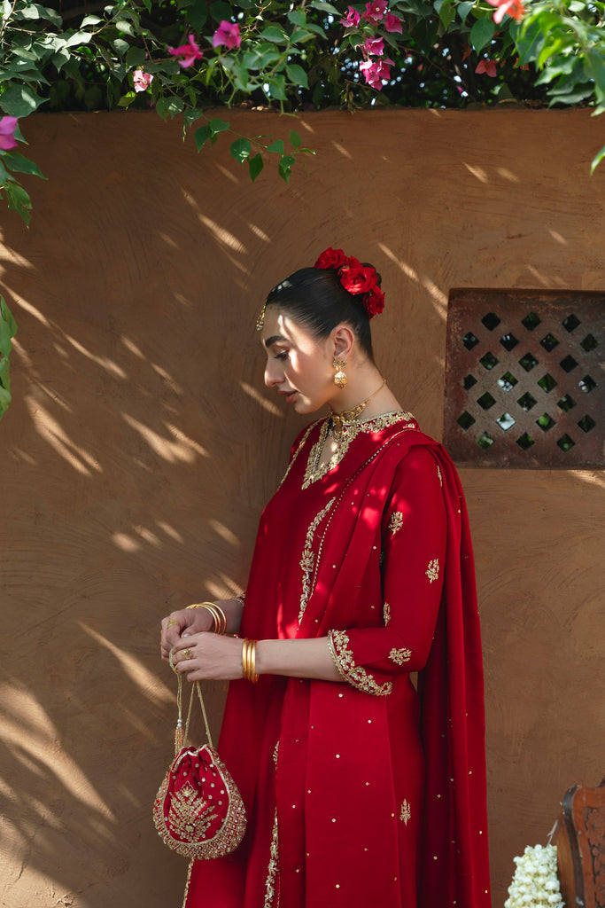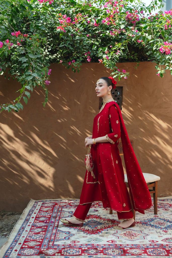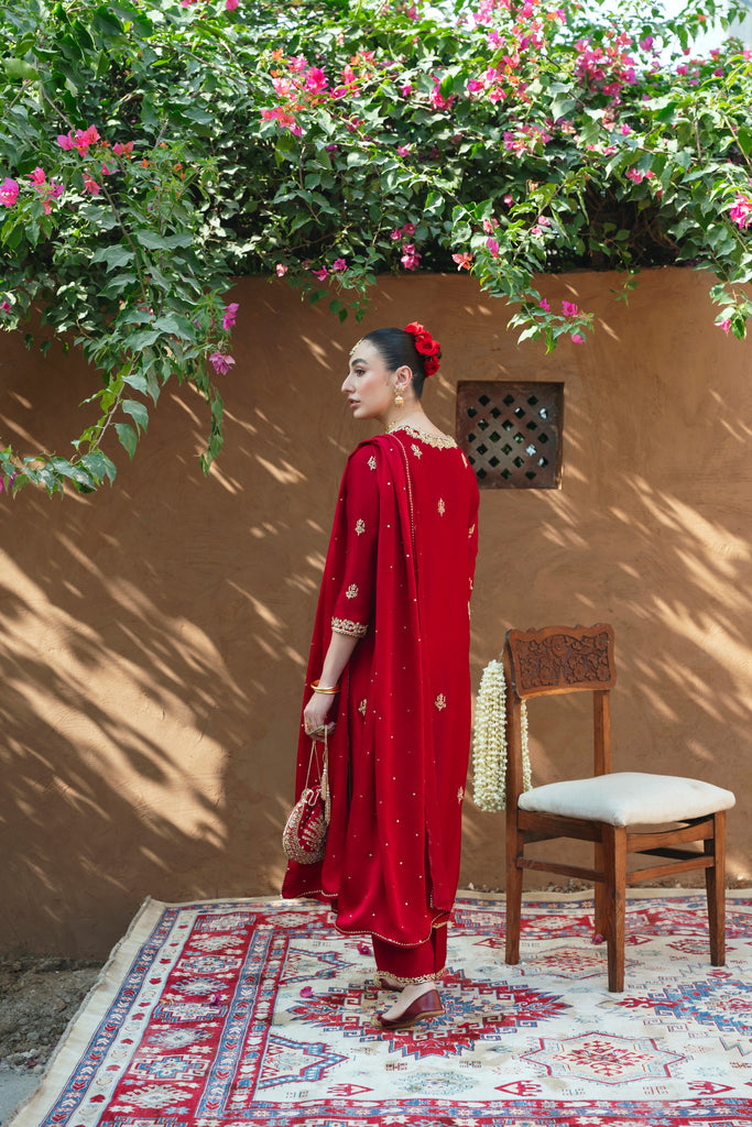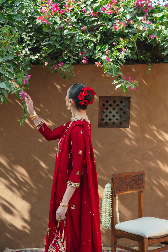 Curated on korean silk in the beautiful maroon jewel hue. Kaur is adorned with the most intricate, gold Ada/handwork of dabka, naqshi, sequins, moti and katori nug, done by our expert artisans. This design is paired with a matching pure soft tissue organza dupatta featuring sequins chaath and matching trousers as seen. Kaur will be your new favourite this festive season. The length of the long kameez is 48 inches.