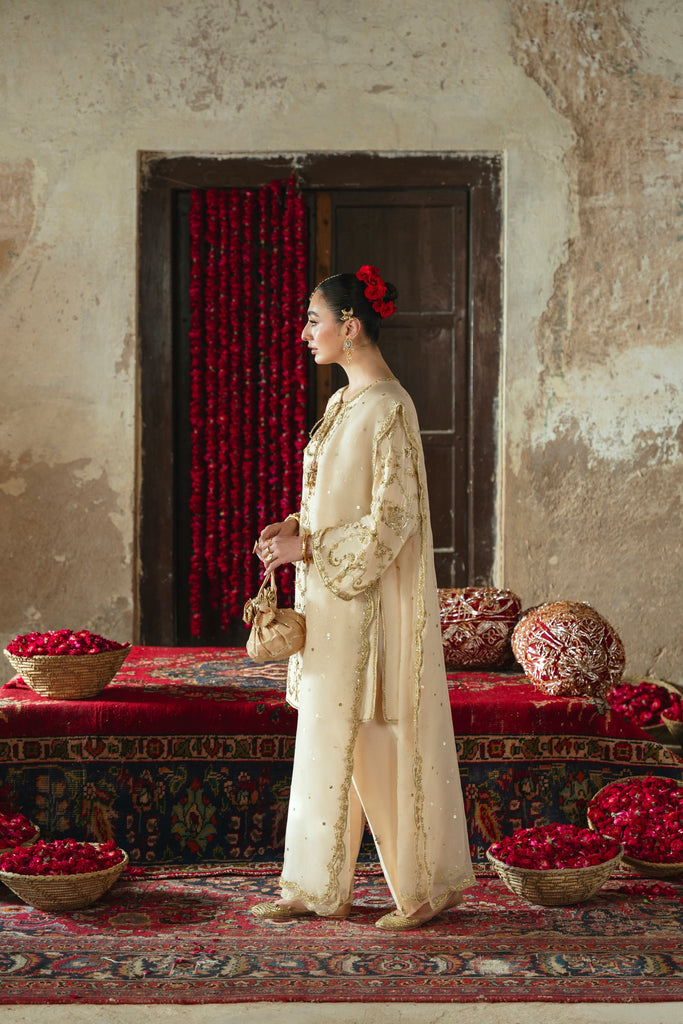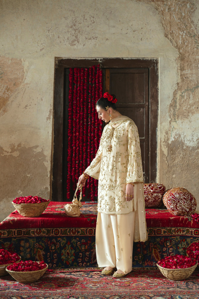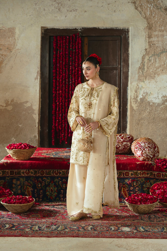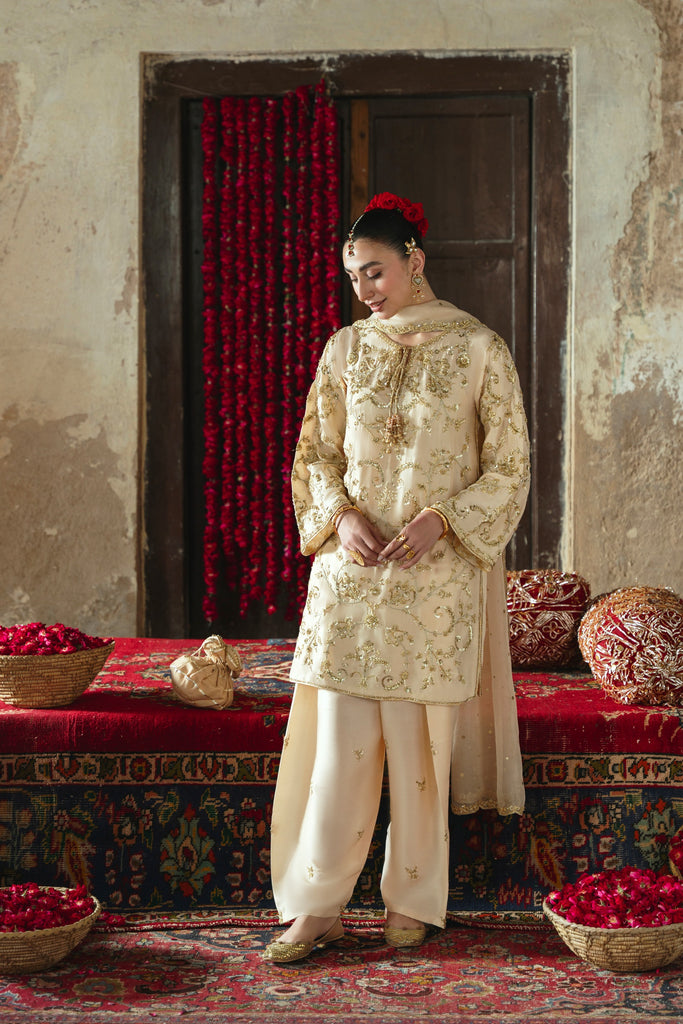 Curated on pure raw silk 60gms in the beautiful soft gold hue. Mehtaab is adorned with the most intricate, gold Ada/handwork of dabka, naqshi, sequins, moti and katori nug, done by our expert artisans, painstakingly taking upto 400+ hours. This design is paired with a matching pure soft tissue organza dupatta featuring a hand scalloped embellished border on 4 sides and a matching shalwar as seen. Mehtaab will be your new favourite this festive season. The length of the kameez is 36 inches.