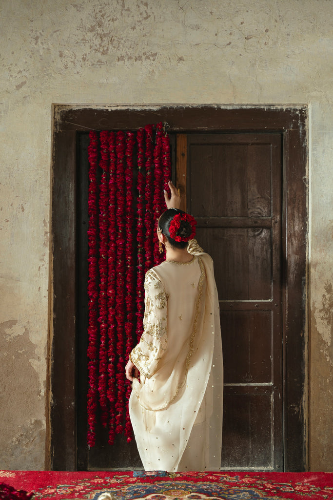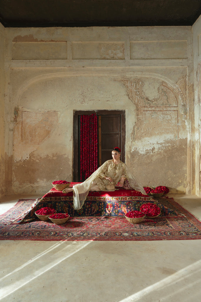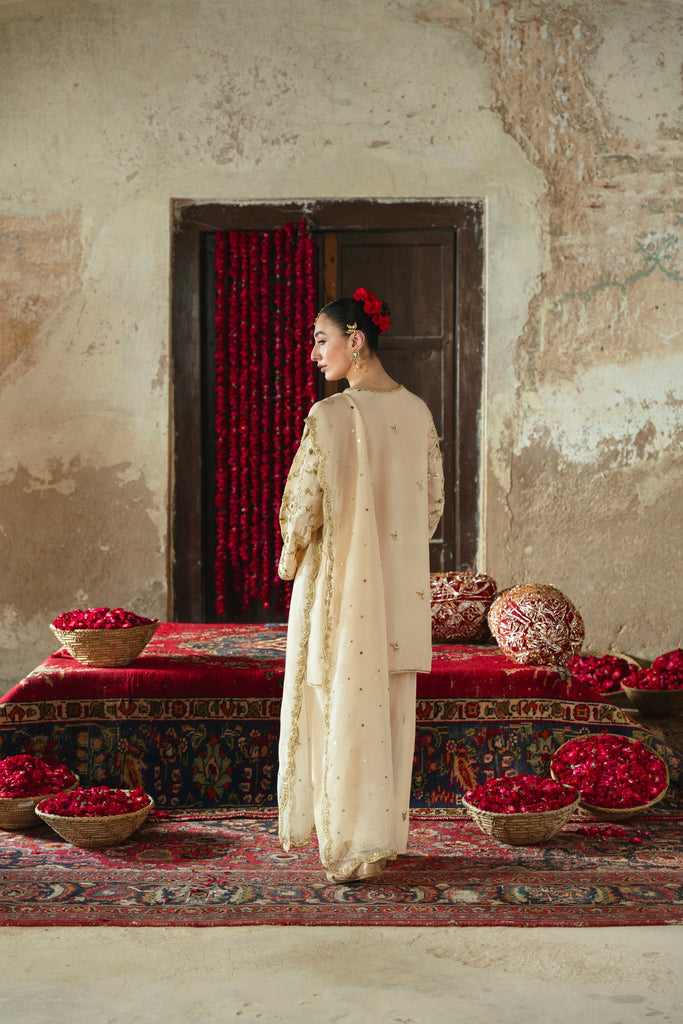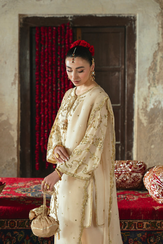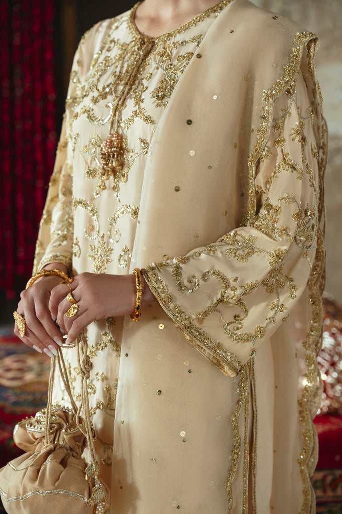 Curated on pure raw silk 60gms in the beautiful soft gold hue. Mehtaab is adorned with the most intricate, gold Ada/handwork of dabka, naqshi, sequins, moti and katori nug, done by our expert artisans, painstakingly taking upto 400+ hours. This design is paired with a matching pure soft tissue organza dupatta featuring a hand scalloped embellished border on 4 sides and a matching shalwar as seen. Mehtaab will be your new favourite this festive season. The length of the kameez is 36 inches.