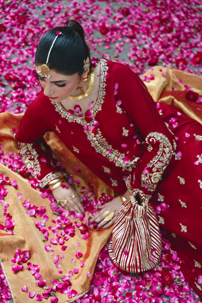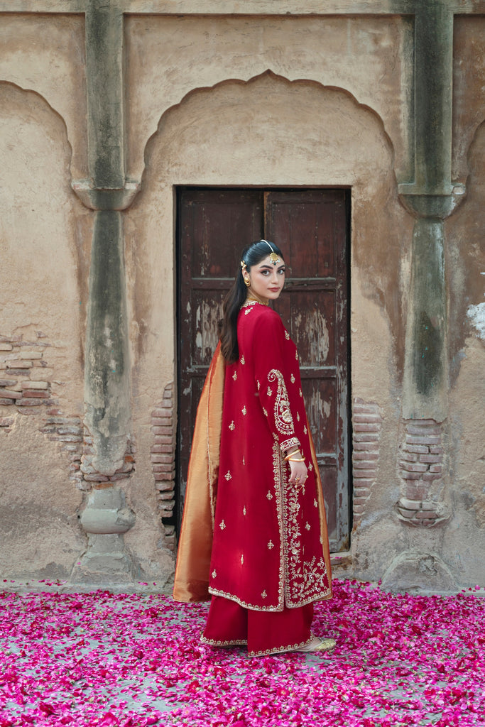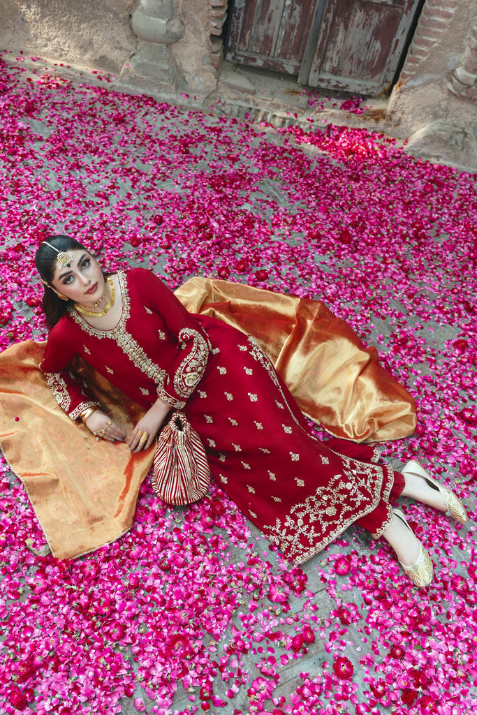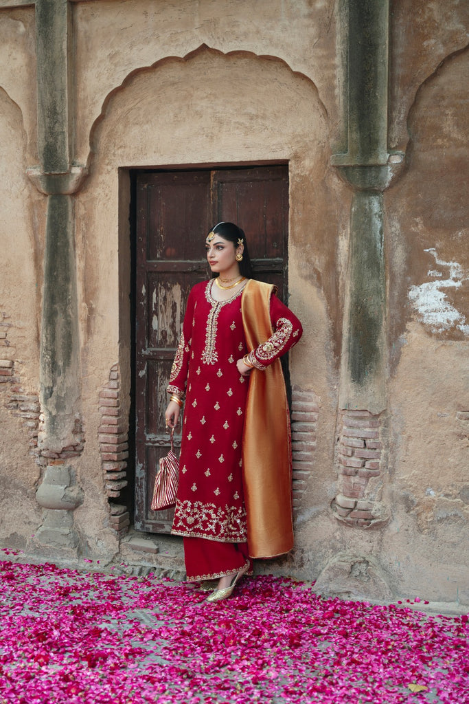 Curated on the finest Korean silk in the beautiful jewel tone of maroon. Mumtaz Rani is adorned with the most intricate, gold Ada/handwork of dabka, naqshi, sequins, moti and katori nug, done by our expert artisans, painstakingly taking upto 350+ hours. This design is paired with a matching pure gold lahma tissue dupatta and a matching Izaar as seen. The length of the kameez is 48 inches.