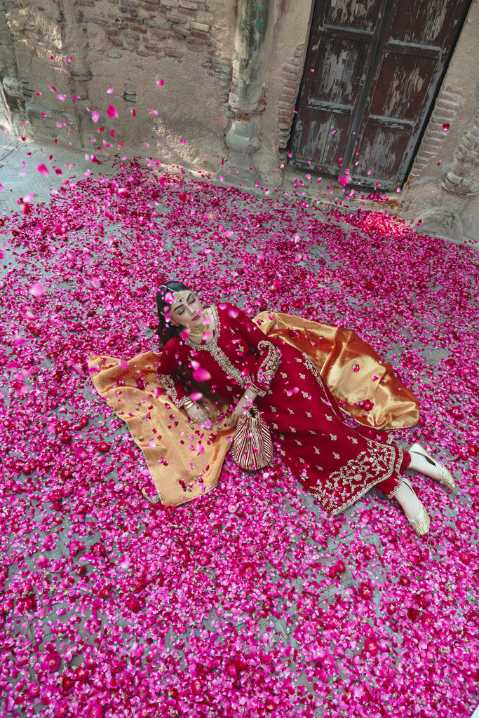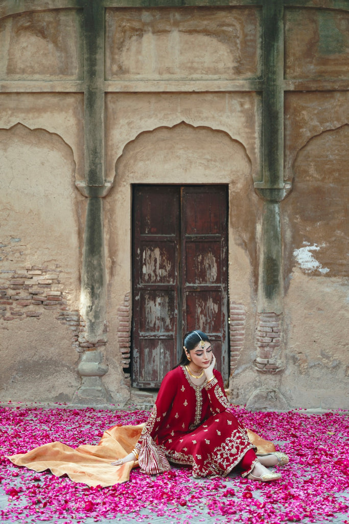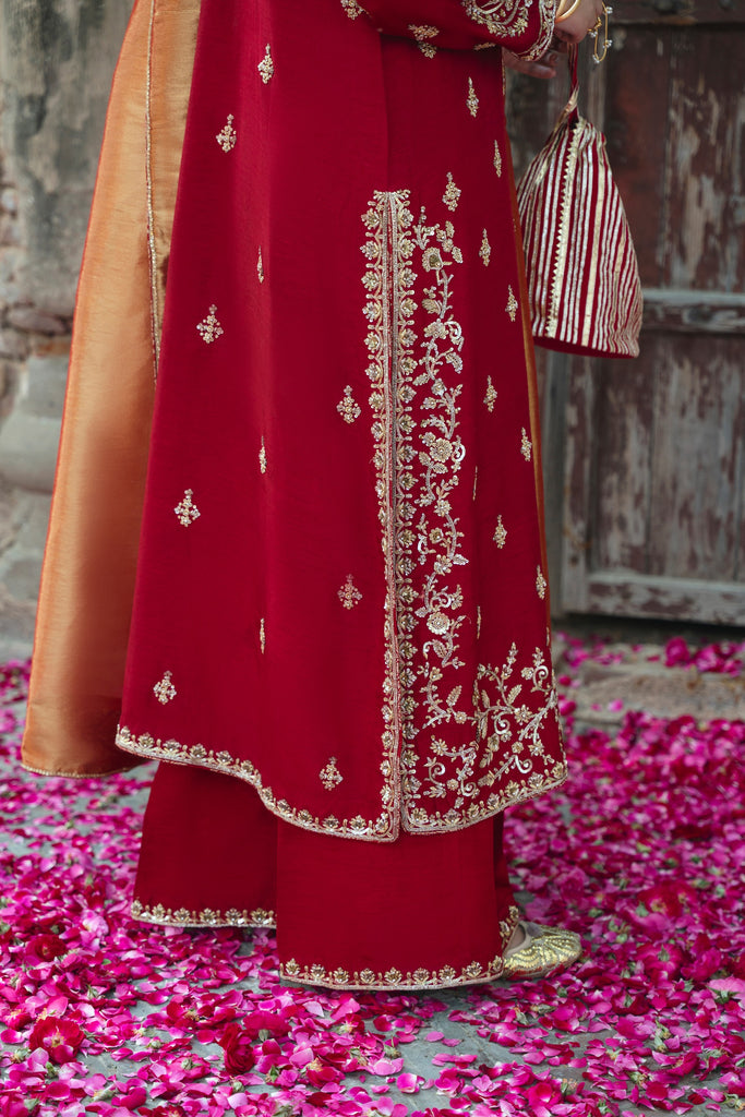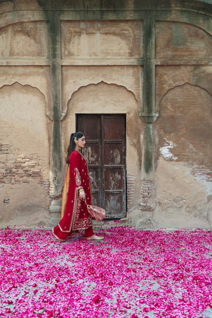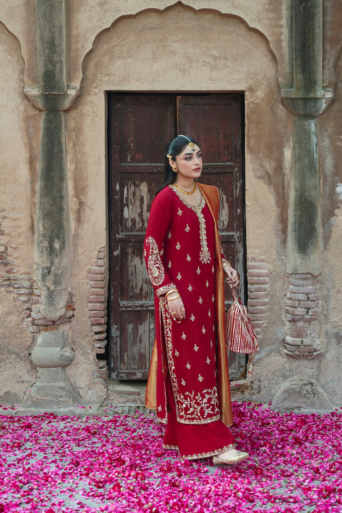 Curated on the finest Korean silk in the beautiful jewel tone of maroon. Mumtaz Rani is adorned with the most intricate, gold Ada/handwork of dabka, naqshi, sequins, moti and katori nug, done by our expert artisans, painstakingly taking upto 350+ hours. This design is paired with a matching pure gold lahma tissue dupatta and a matching Izaar as seen. The length of the kameez is 48 inches.