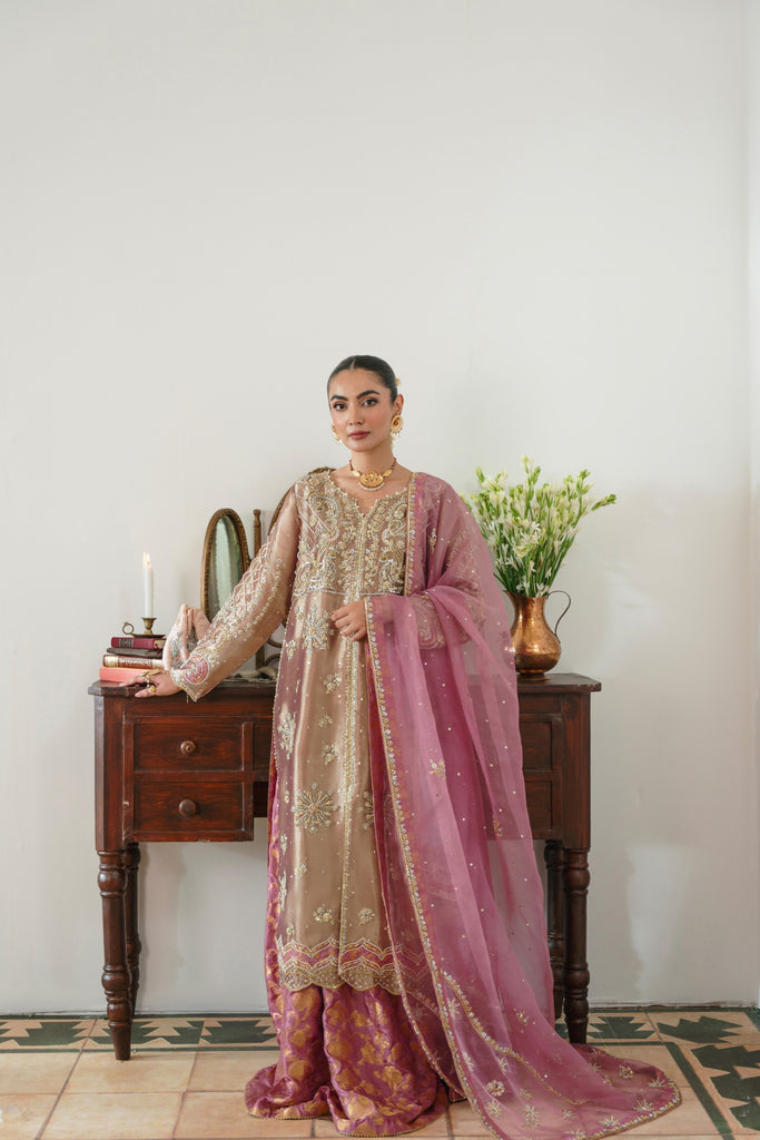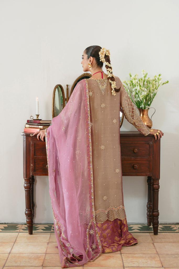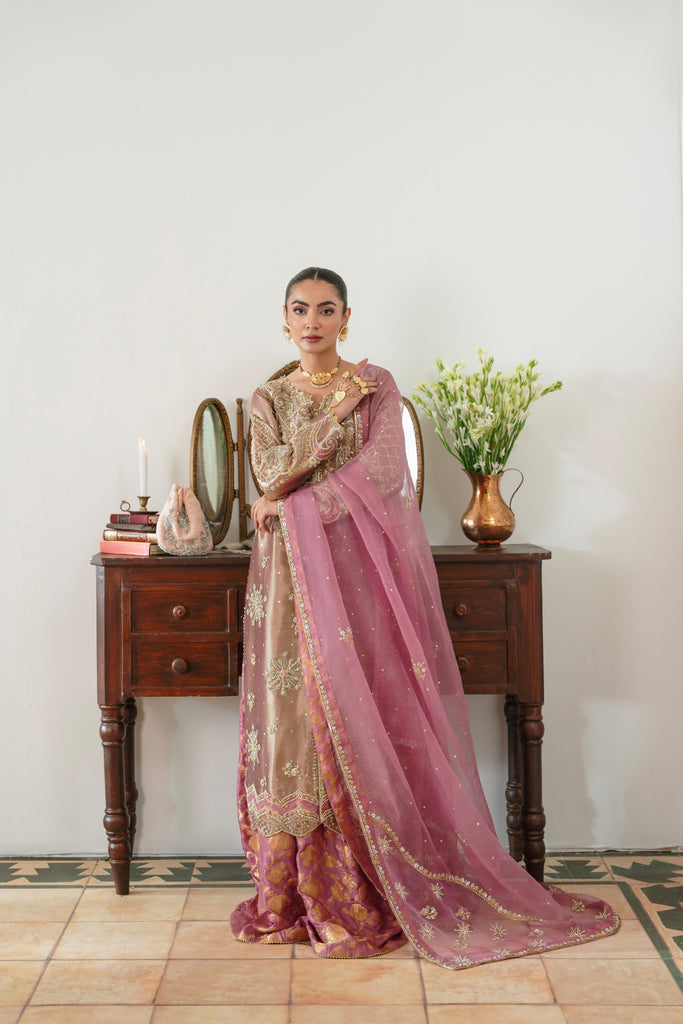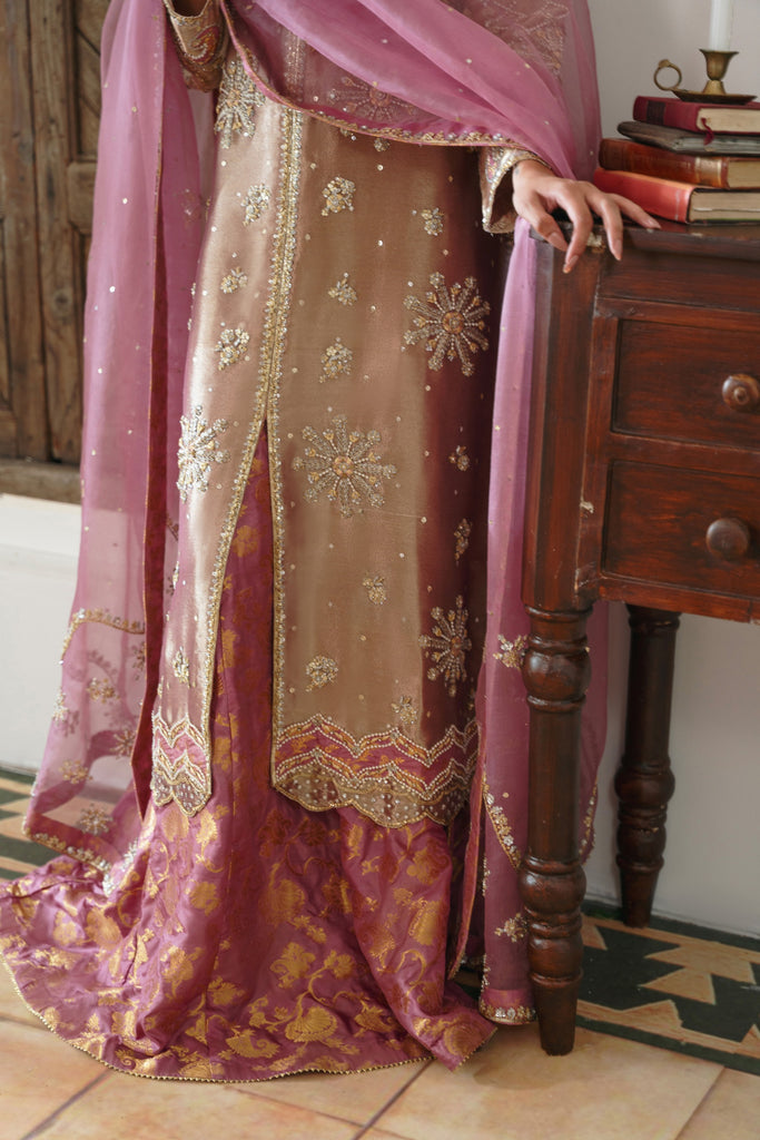 A vision of timeless poise and femininity, this lahma ensemble captures the essence of refined wedding wear. An alluring lahma base makes up for Navena, intricately embellished with exquisite zardozi handwork in naqshi, dabka, sequins, and crystals alongside mauve accents. Paired with a regal embellished pure brocade skirt that adds timeless grandeur to the silhouette. The look is completed with a mauve soft tissue organza dupatta, beautifully adorned with hand embellishments, creating a romantic and elegant ensemble. The length of the long kameez is 48 inches. The model is 5 feet 5 inches tall with heels.