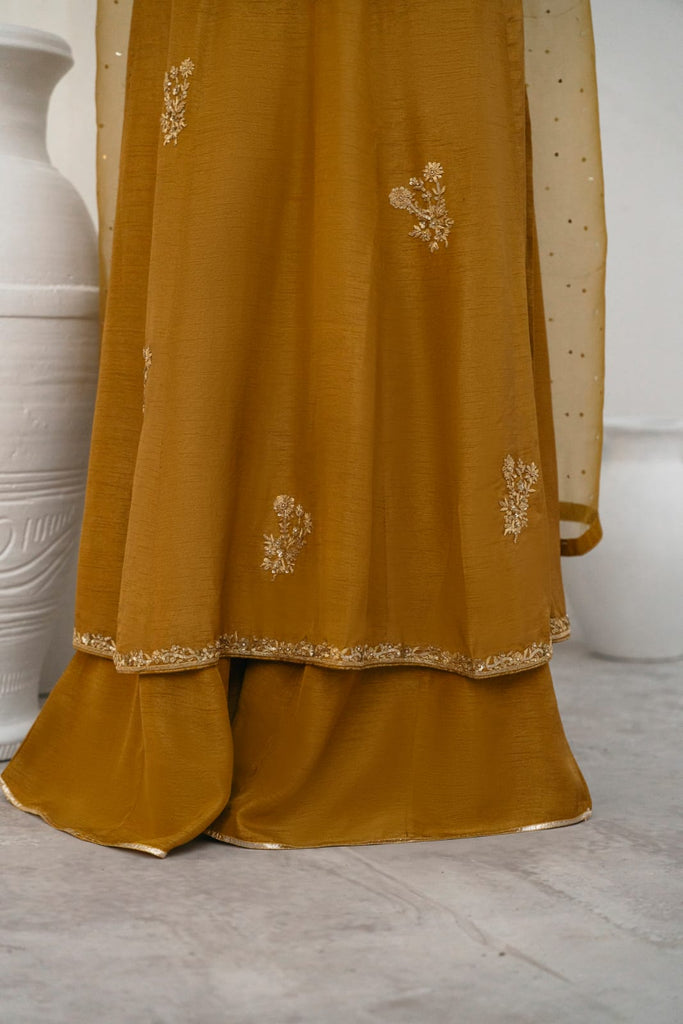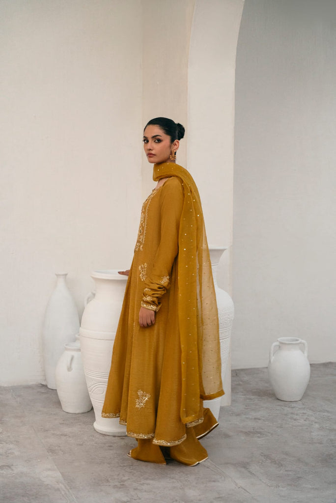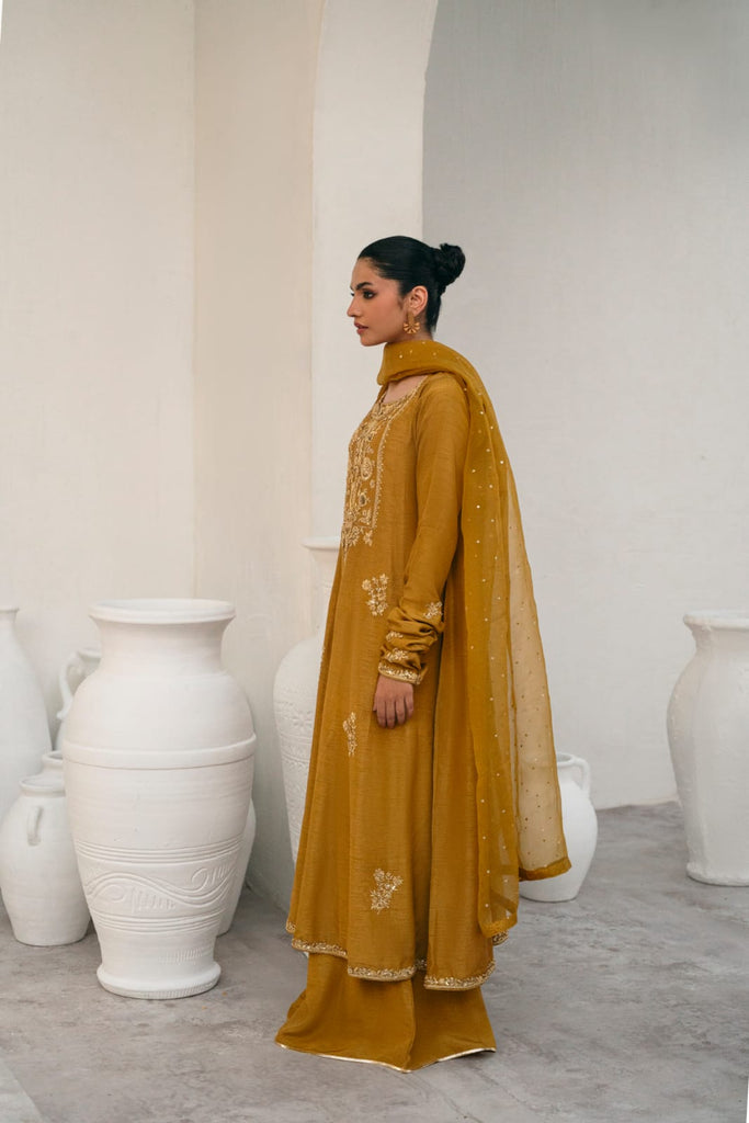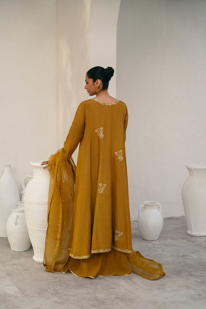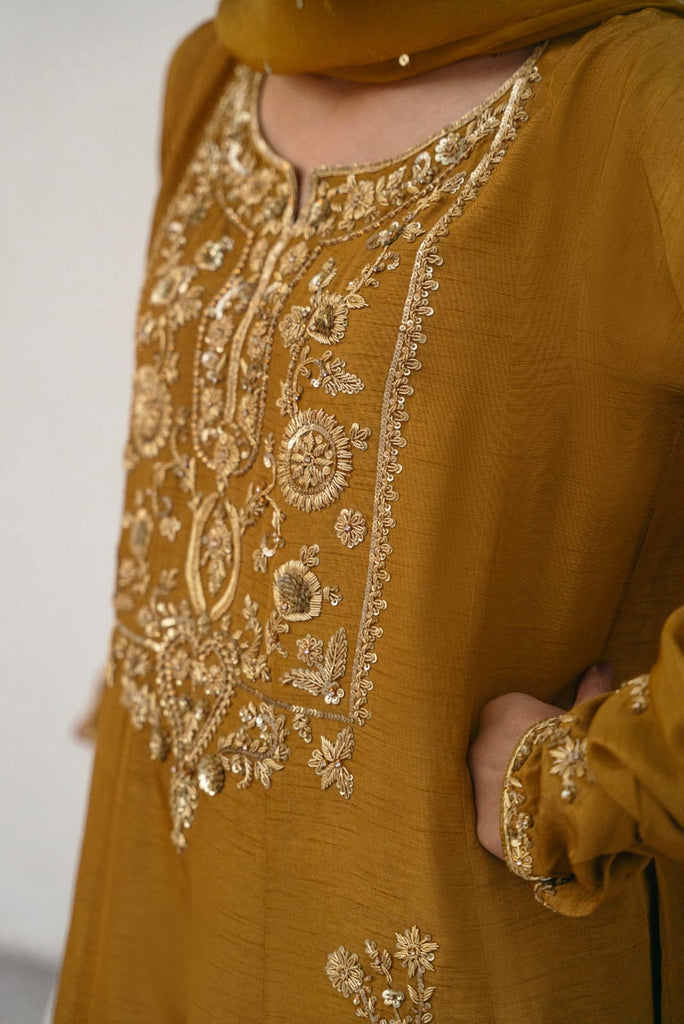 Sheeba, with its spellbinding korean silk long kalidaar silhouette, is a celebration of craftsmanship and refined taste. The long kalidaar is rendered in the most beautiful shade of mustard yellow is an absolute work of art, heavily embellished with ada/hand work of dabka, naqshi, sequins and crystals adding a touch of regality and alluring charm to the overall look. A three piece that you will keep coming back to. The length of the long kalidaar is 48 inches.