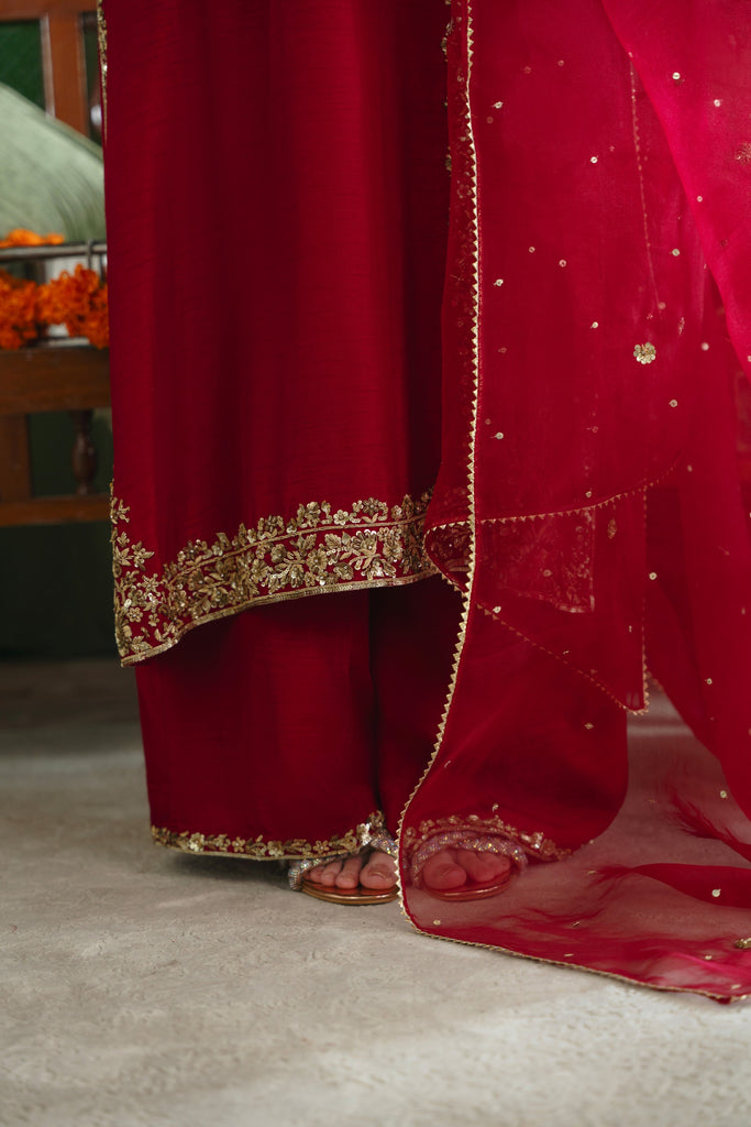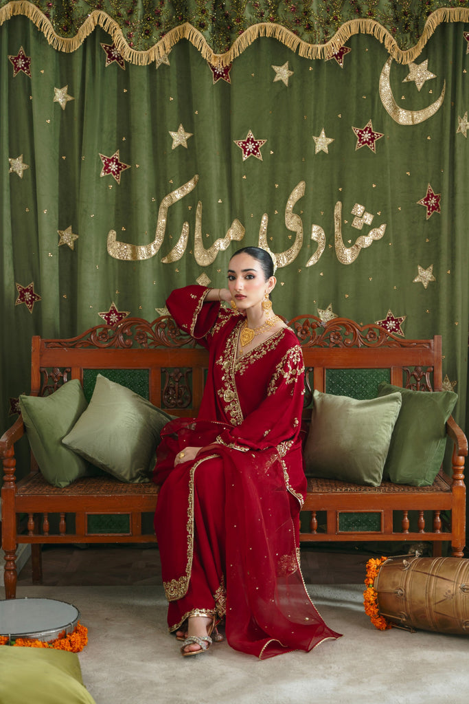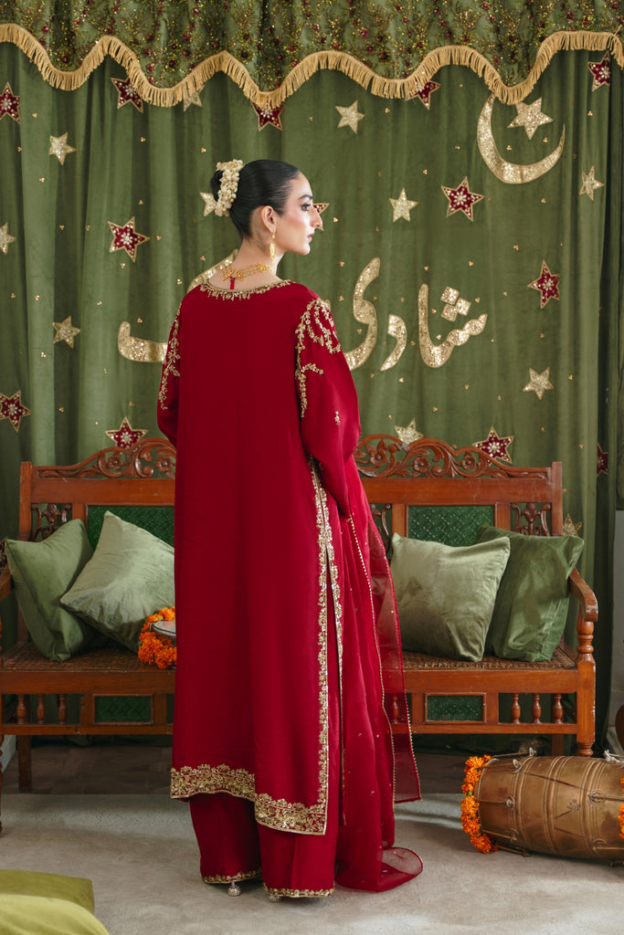The signature Agha Noor details that are hard to miss. Cut from korean raw silk on an alluring crimson canvas, '' Zella '' is an absolute must have. Heavily embellished with gold ada/handwork consisting of dabka, naqshi, sequins and nug, done by expert artisans taking upto 300+ hours, with a matching korean raw silk Izaar as seen, the pure tissue organza dupatta is adorned with sequins and boti spray. The length of the long kameez is 48 inches.