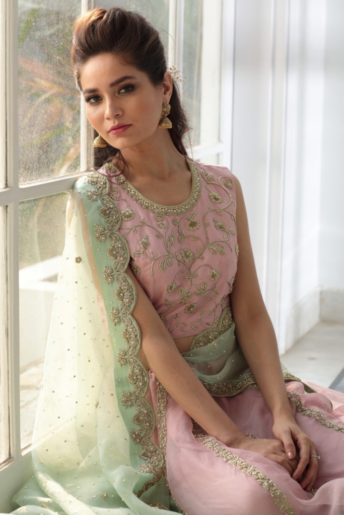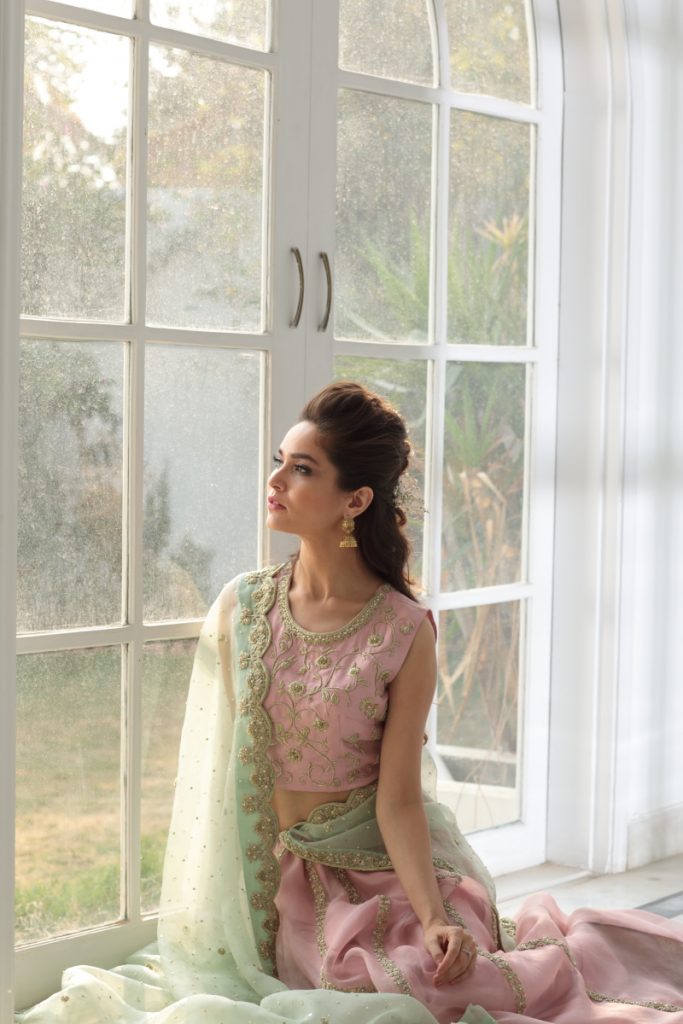 Stand out in our beautiful blush pink blouse and skirt, heavily embellished blouse with floral details of pearls and sequins. Adorned with mint green scallop ornament dupatta, this beautiful silhouette serves perfectly from engagement to day time nikkah brides.